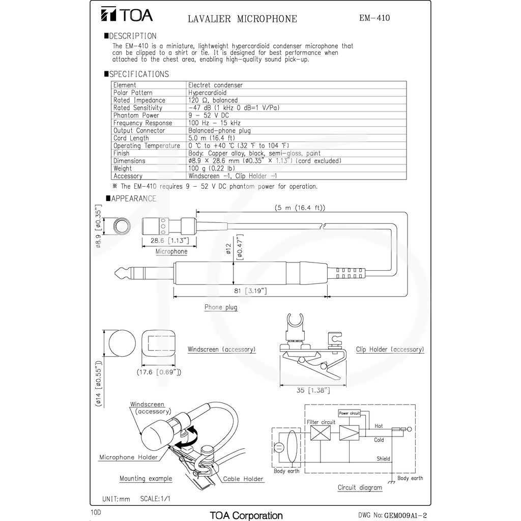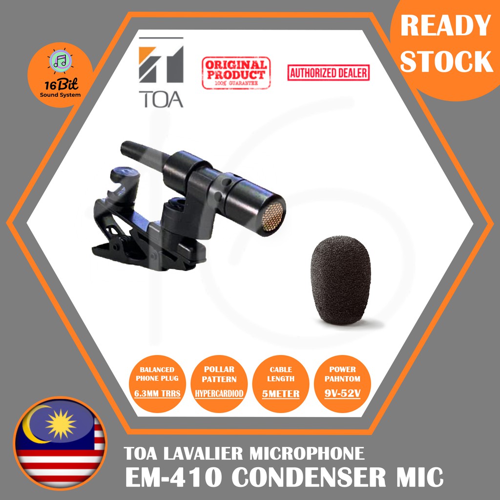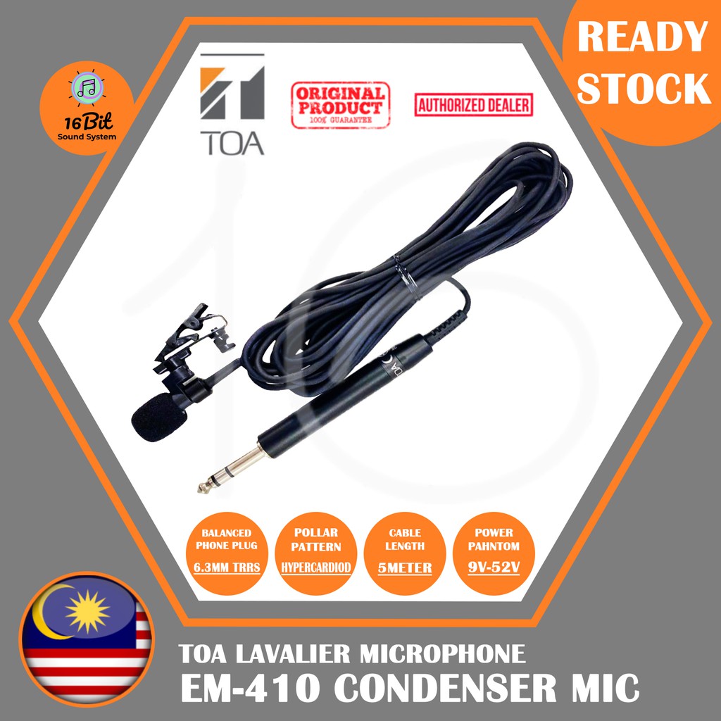 TOA Clip Microphone Condenser Microphone EM-410 Lavalier Microphone operate with 9~52V DC Phantom Power (EM410)