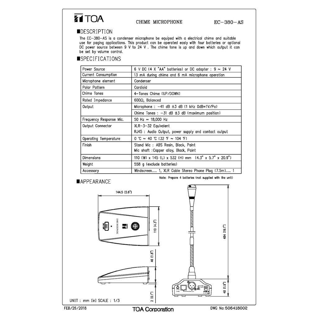 TOA EC-380 Chime Microphone [6V DC (4X "AA" Batteries) Or DC Adapter (9-52V)] (EC380)