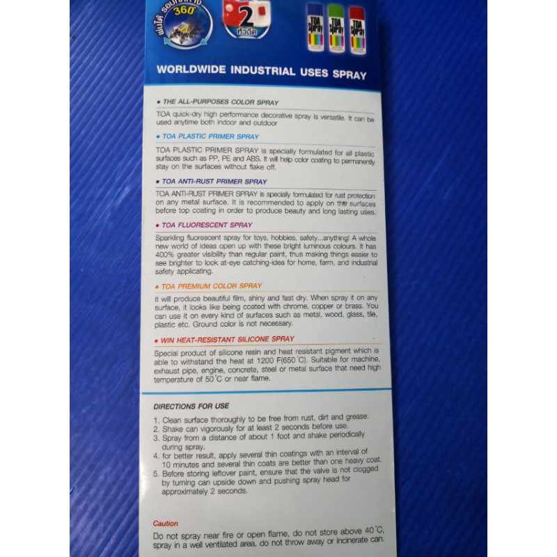 TOA SPRAY PAINT/ACRYLIC LACQUER SPRAY FLUORESCENT COLOURS