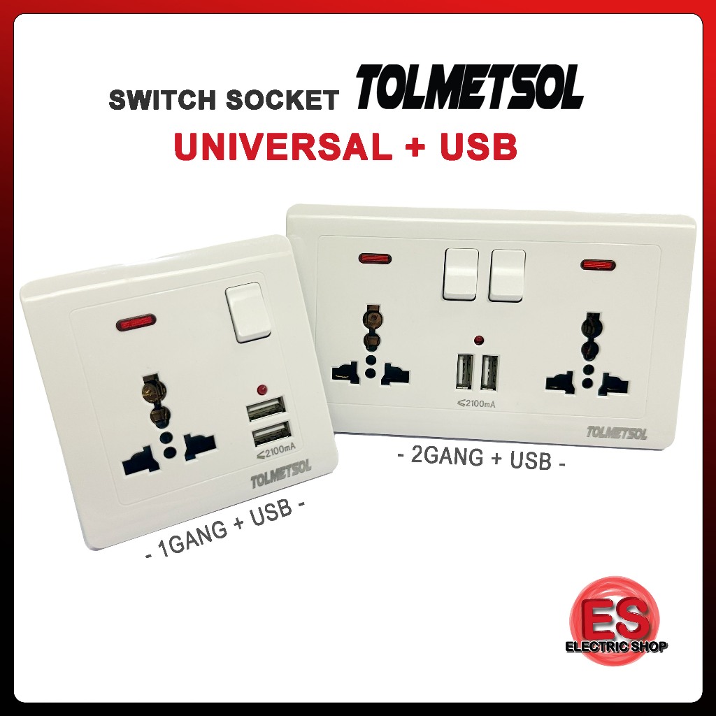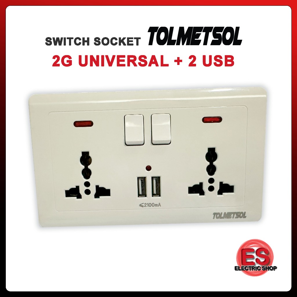 TOLMETSOL Universal Wall Socket with 2 USB Port USB Socket USB Plug Switch Socket