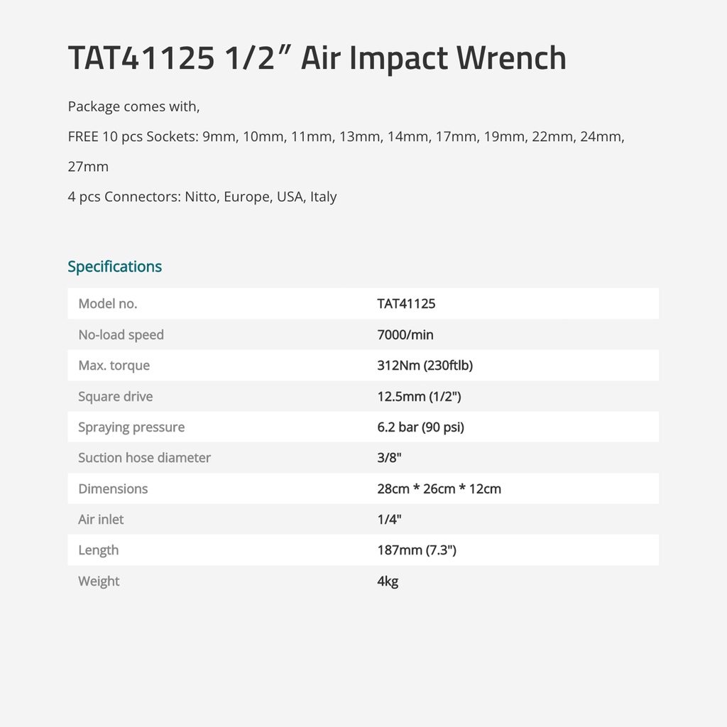 TOTAL Air Impact Wrench (1/2"/312Nm) [Free Sockets 10 Pcs 9mm-27mm + Connectors 4 Pcs Nitto/EU/US] TAT41125