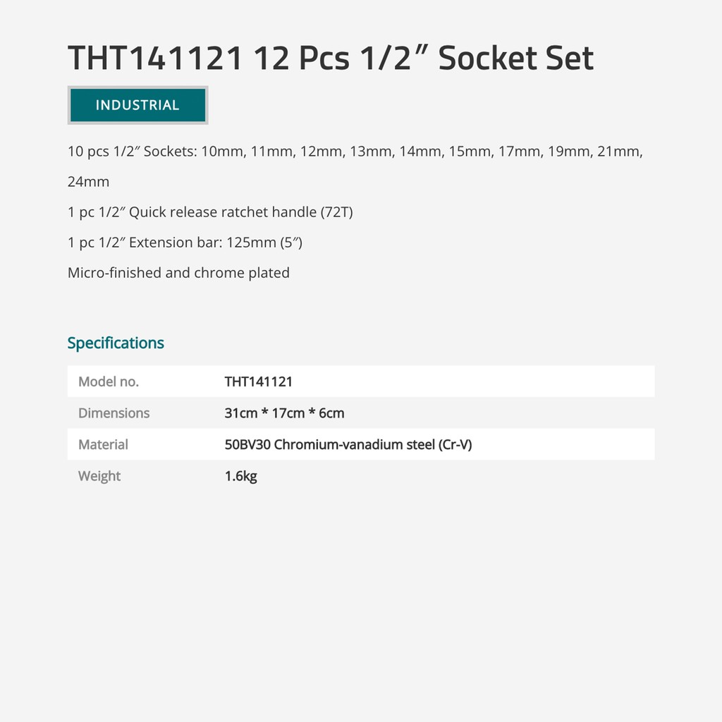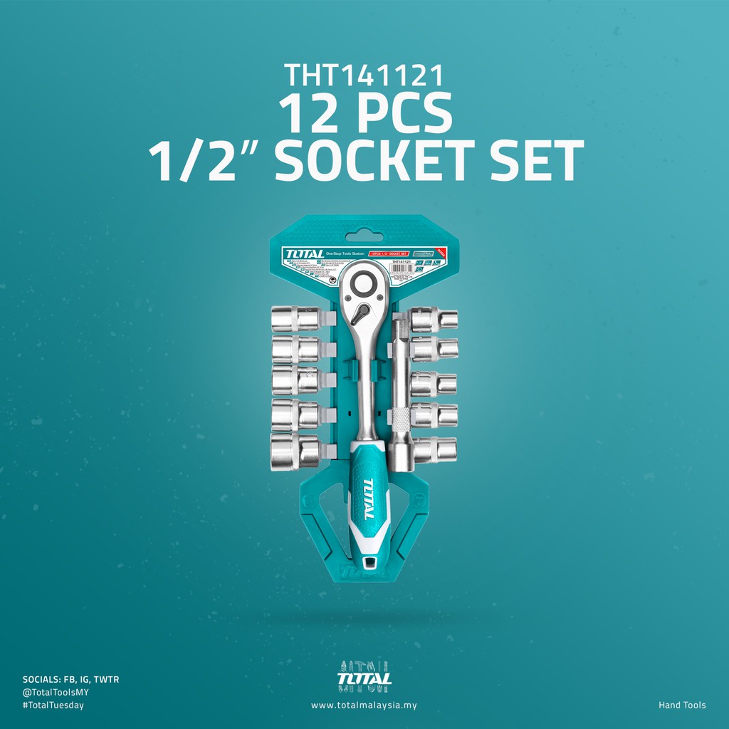 TOTAL Socket Set - Sockets (1/2"/10mm-24mm/10 Pcs) + Quick Release Ratchet Handle + Bar THT141121
