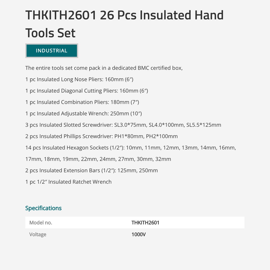 TOTAL Insulated Hand Tools Set With Pliers, Ratchet Wrench, Screwdriver & Hex Socket (1000V/26 Pcs) THKITH2601