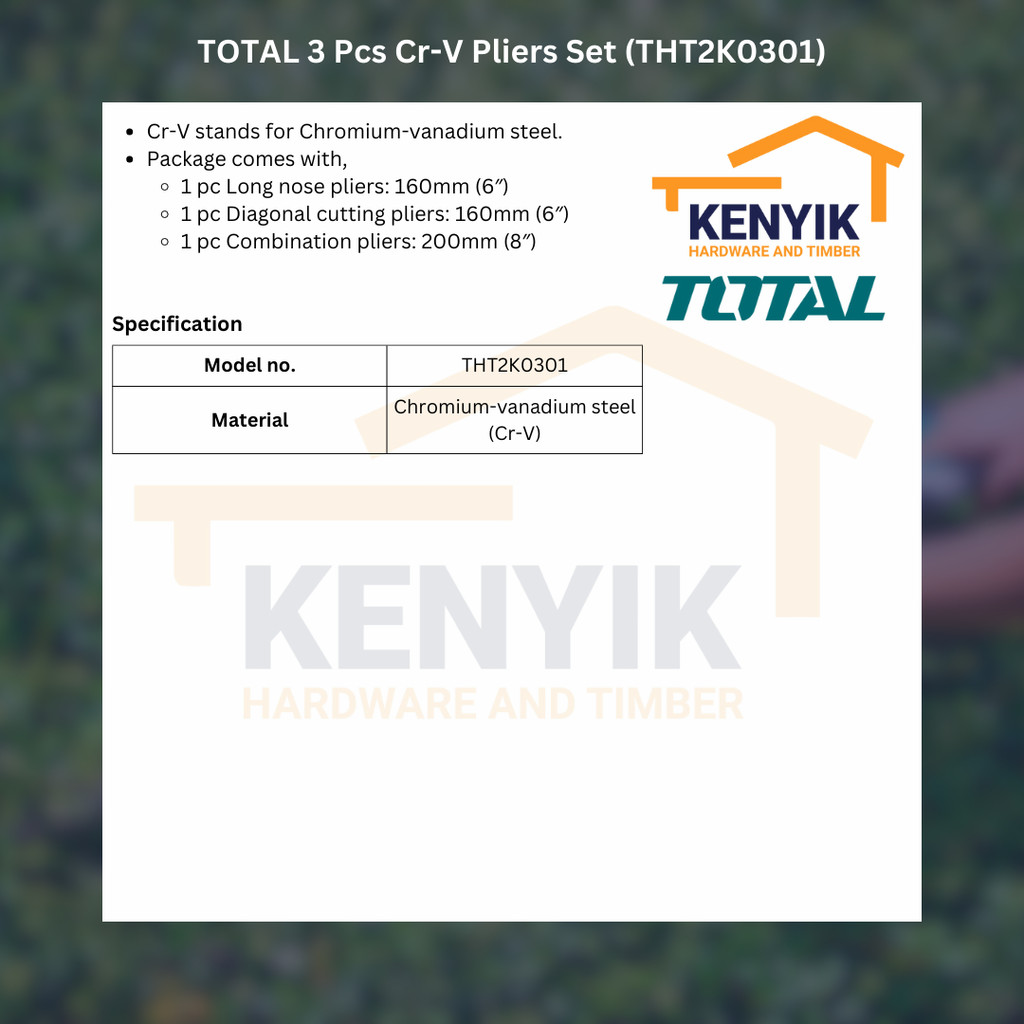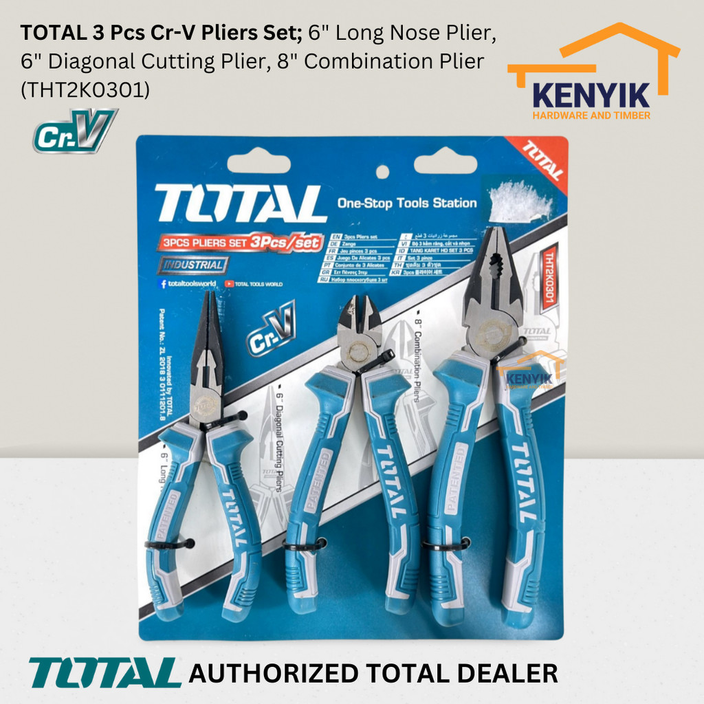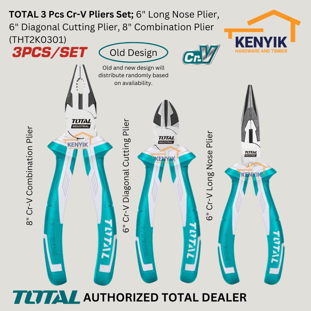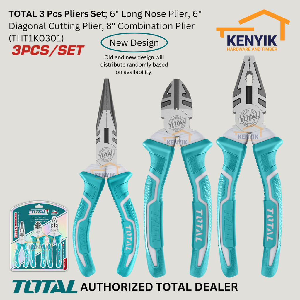 TOTAL 3 Pcs Pliers Set; 6" Long Nose Plier, 6" Diagonal Cutting Plier, 8" Combination Plier (THT1K0301)