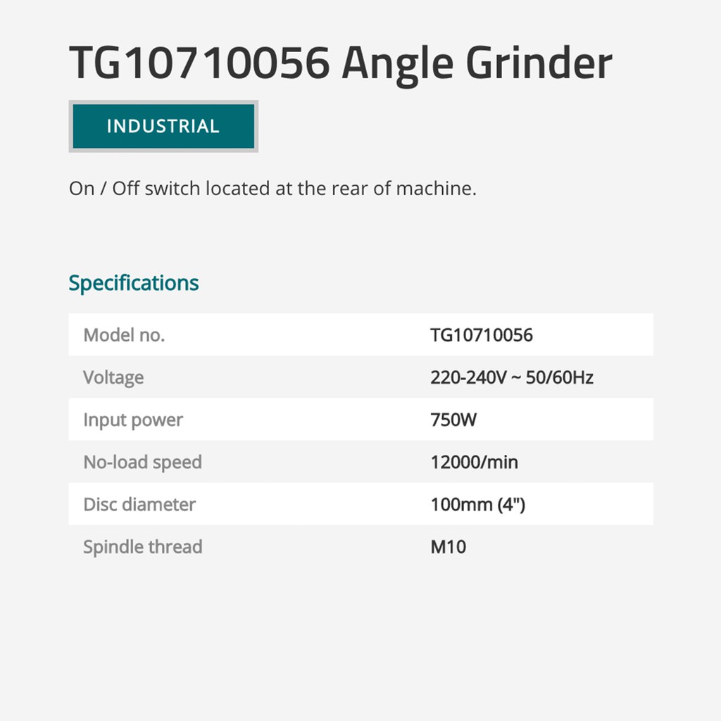 TOTAL Angle Grinder M10 Thread With Back/Rear Switch (750W/4") TG10710056