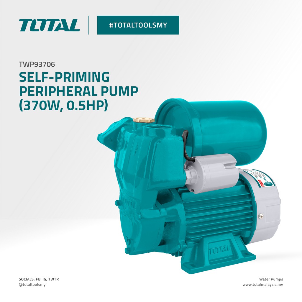 TOTAL Automatic Self-Priming Peripheral Pump Pipe (370W/0.5HP/Max Head 35M/Max Suction 8M/1"/IP4X) TWP93706