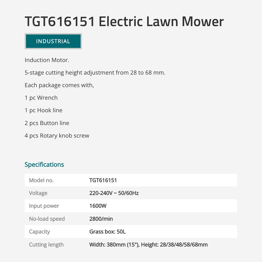 TOTAL Electric Lawn Mower Induction Motor Adjustable Cutting Height (28mm-68mm/1600W) + Grass Box (50L) TGT616151