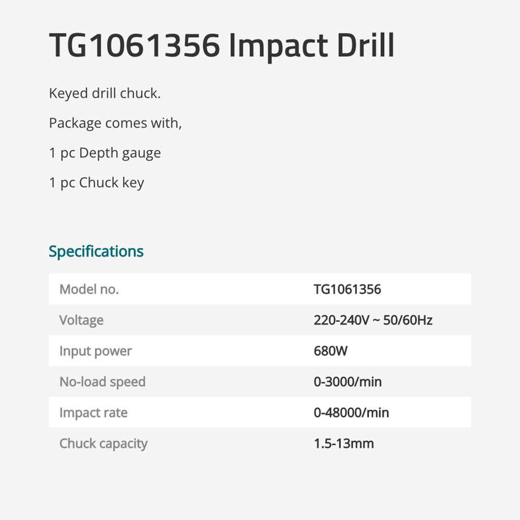 TOTAL Impact Drill + Depth Gauge + Chuck Key (680W/Keyed Chuck Size 1.5mm-13mm) TG1061356