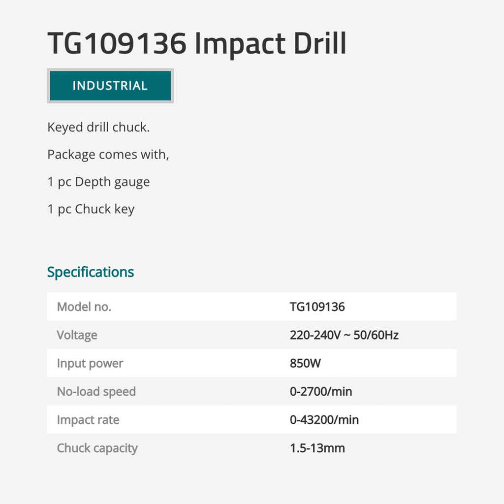 TOTAL Impact Drill + Depth Gauge + Chuck Key (850W/Keyed Chuck Size 1.5mm-13mm) TG109136