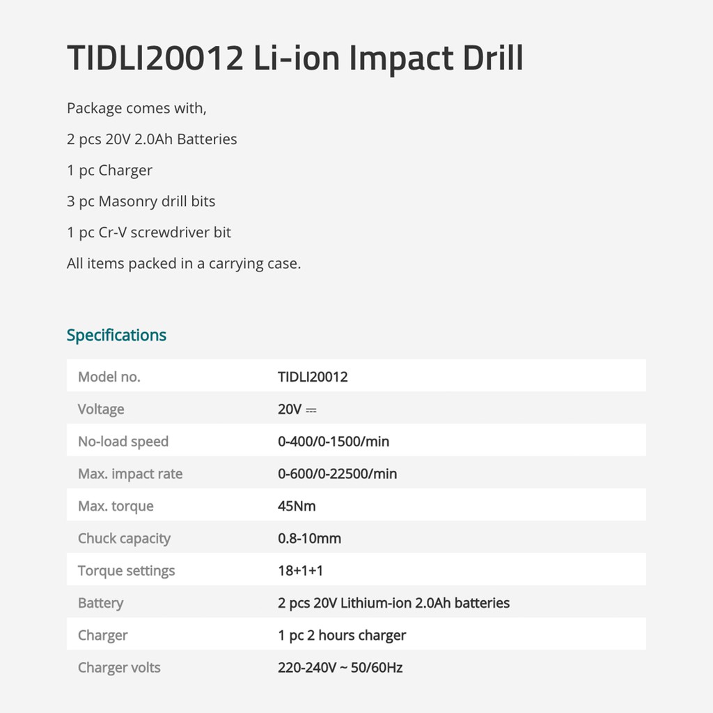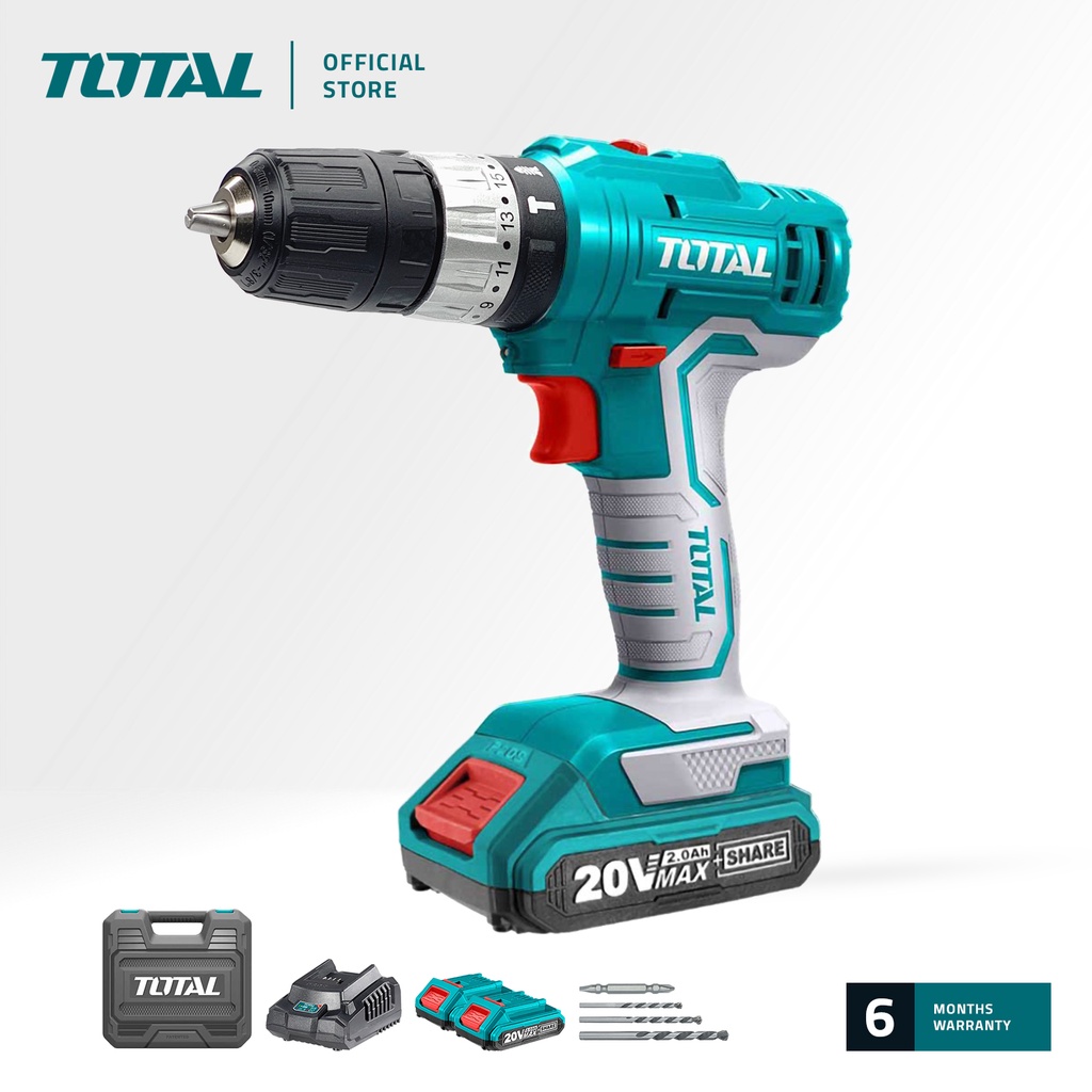 TOTAL Li-ion Cordless Impact Drill (45Nm, 10mm) + 2 pcs 2.0Ah Battery + 1 pc 2000mAh Charger, P20S 20V - TIDLI20012