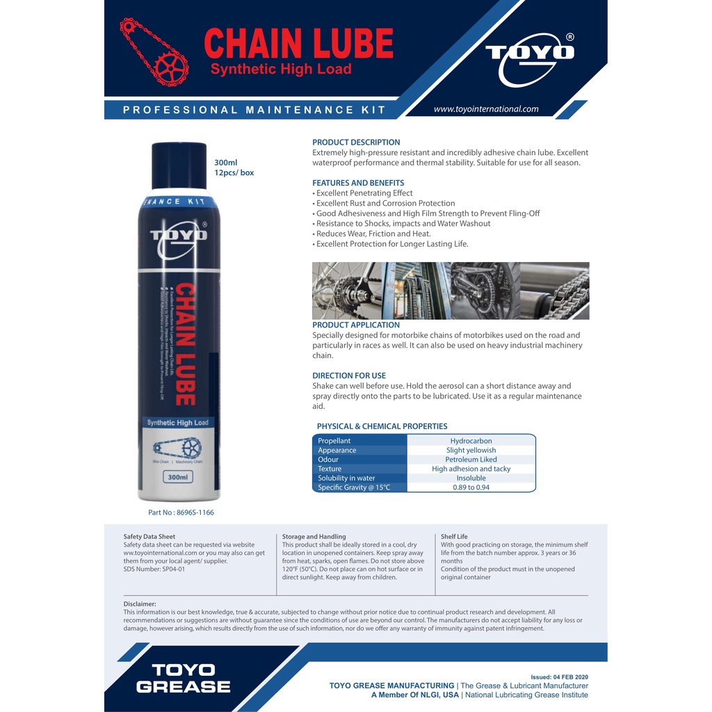 TOYO CHAIN LUBE SYNTHETIC AEROSOL SERIES [300ML] CHAIN BRUSH LUBRICANT SPRAY GREASE **Ready Stock**