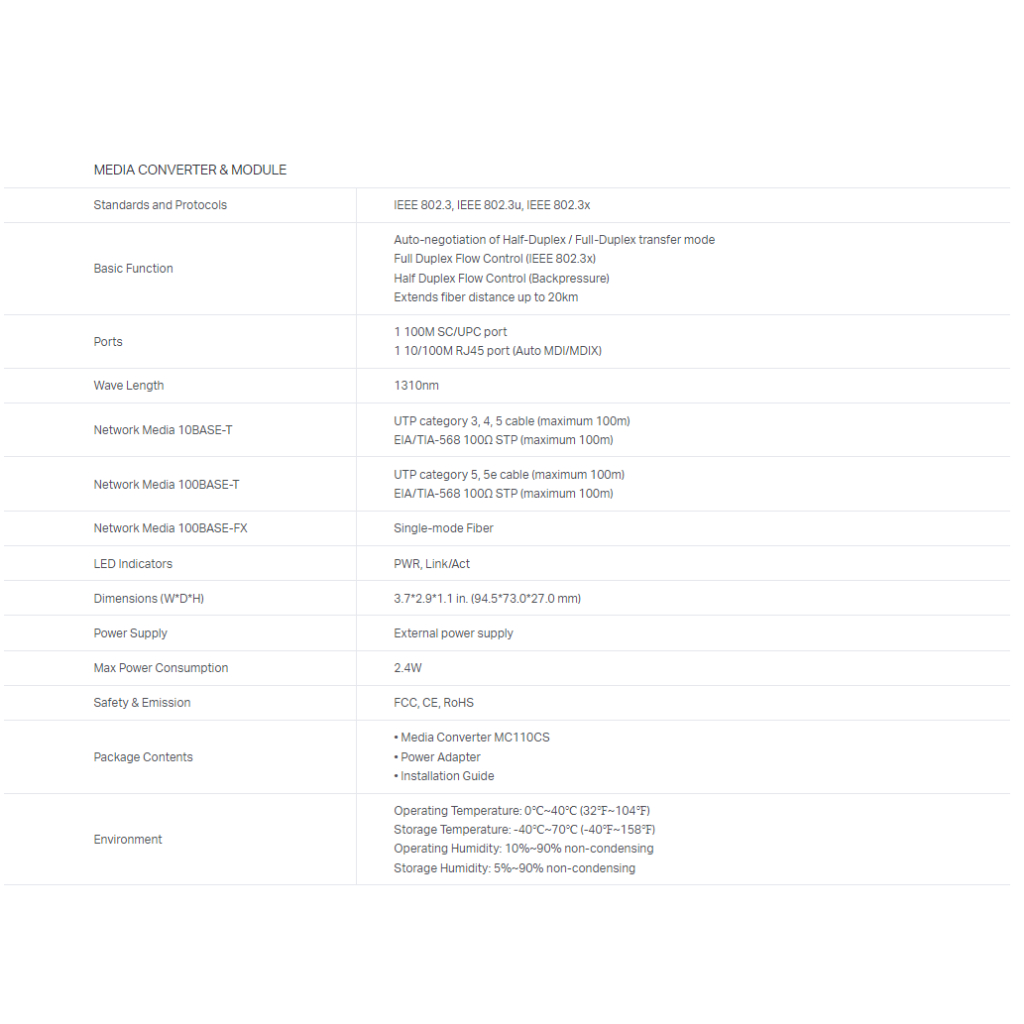 TP-LINK Tplink 10/100 Mbps Singlemode 2KM Media Converter RJ45 Ethernet LAN Port to SC MC110CS
