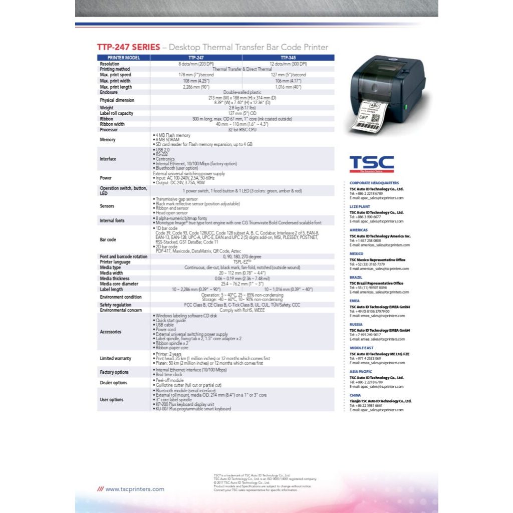 TSC TTP 247 4 inch Desktop Thermal Transfer Barcode Label Printer (usb+com+lpt)