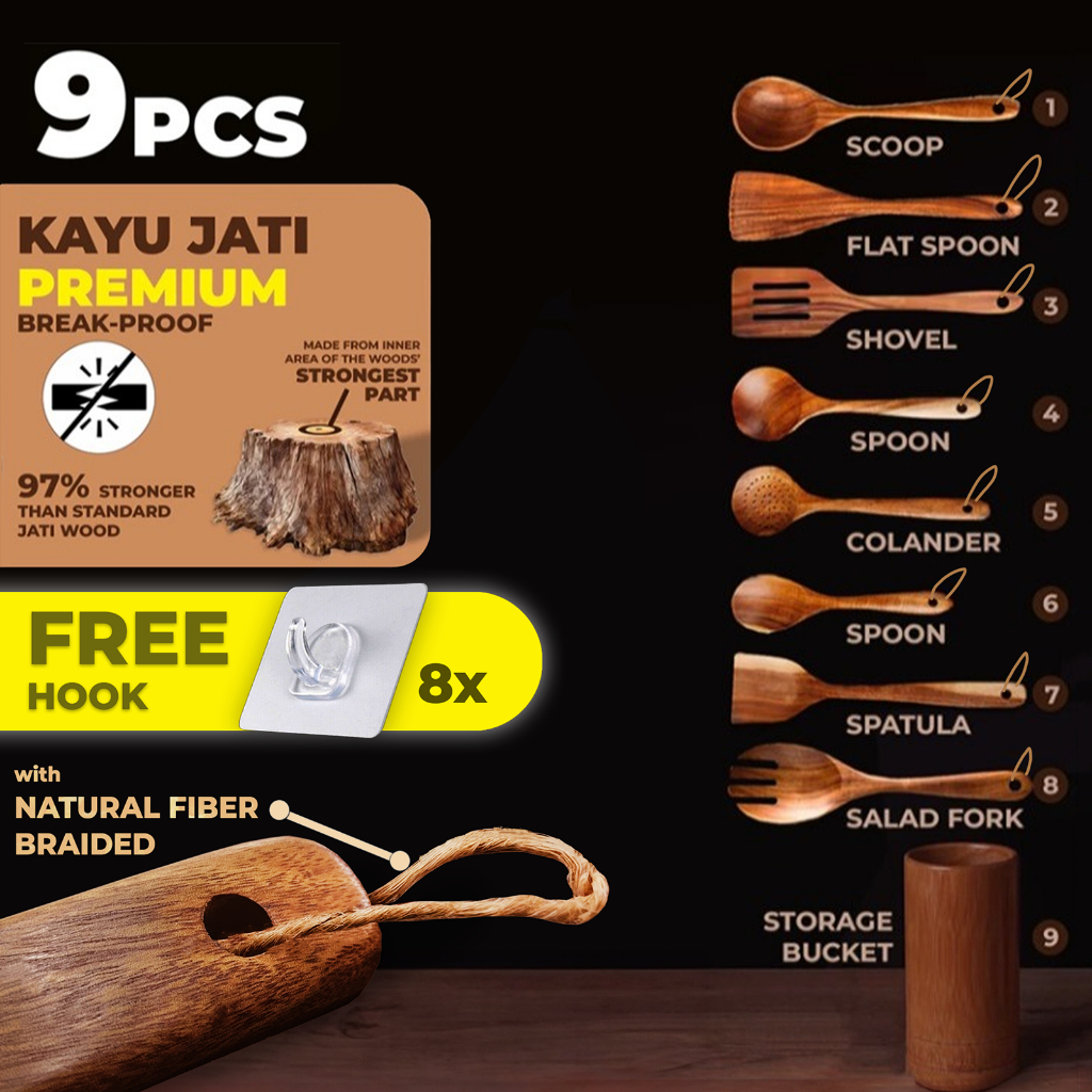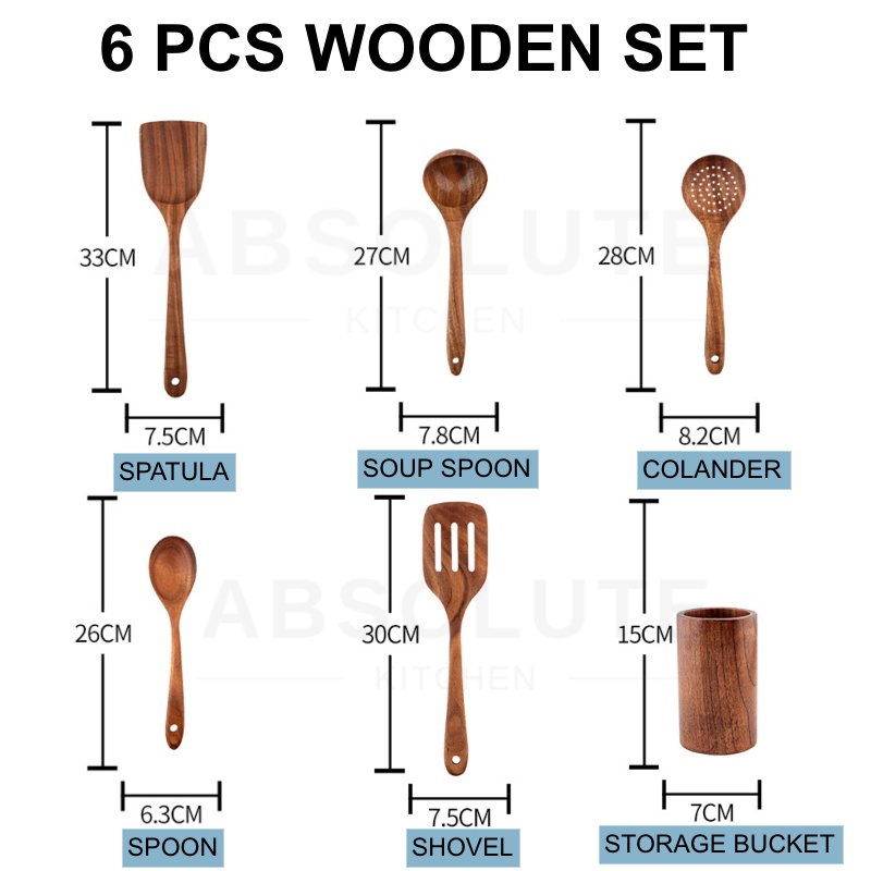 READY STOCK🇲🇾6PCS Kitchen Teak Natural Wood Tableware Ladle Turner Soup Skimmer Cooking Spoon Scoop Spatula Senduk Dapur