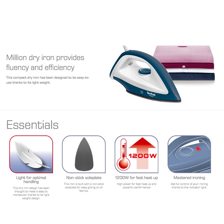 Tefal Easygliss Dry Iron (1200W) FS4030/Tefal Million Dry Iron FS2620 / Electrolux 1300W Dry Iron EDI1004 / Phison