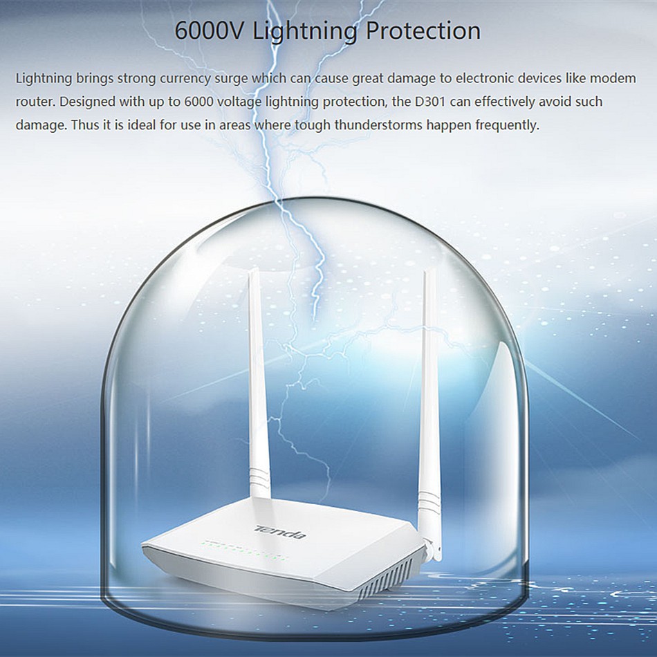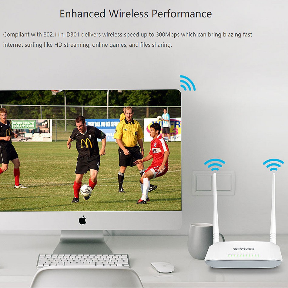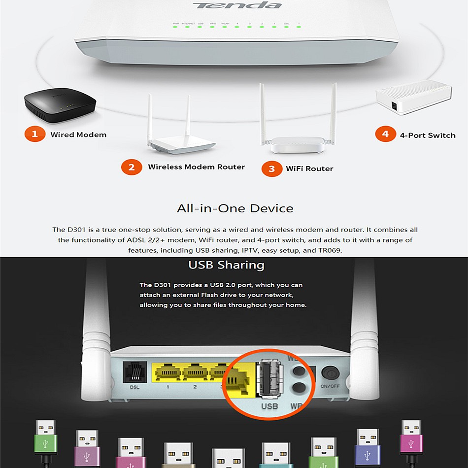 Tenda D301 V2 Wireless 300mbps ADSL2+ Modem WiFi Streamyx Router with USB Sharing Port