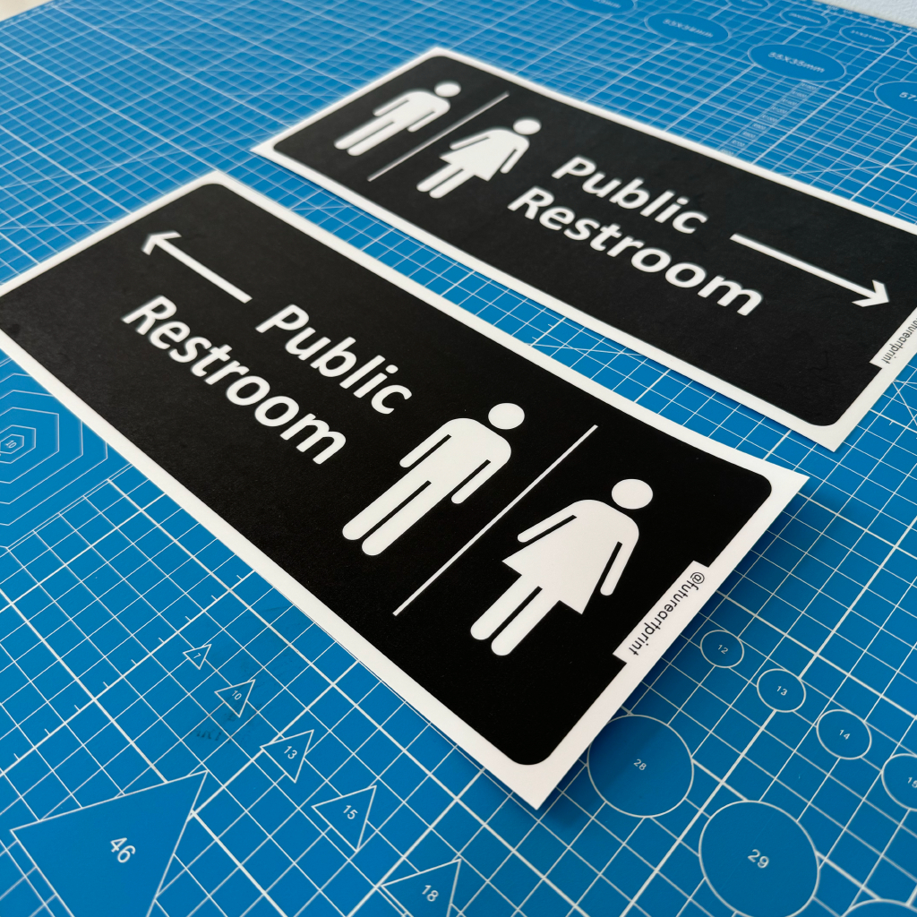 Toilet Public Restroom Arrow Direction. No Smoking. Keep Toilet Clean. Premium Sticker Sign Signage. White Blue Black.