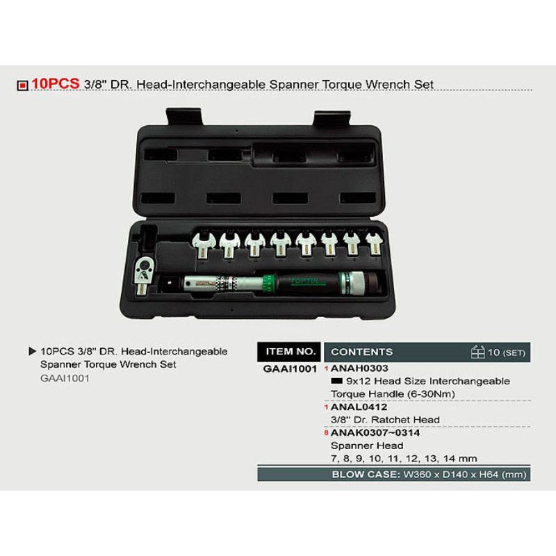 Toptul GAAI1001 - 10pcs 3/8" DR. Head-Interchangeable Spanner Torque Wrench Set