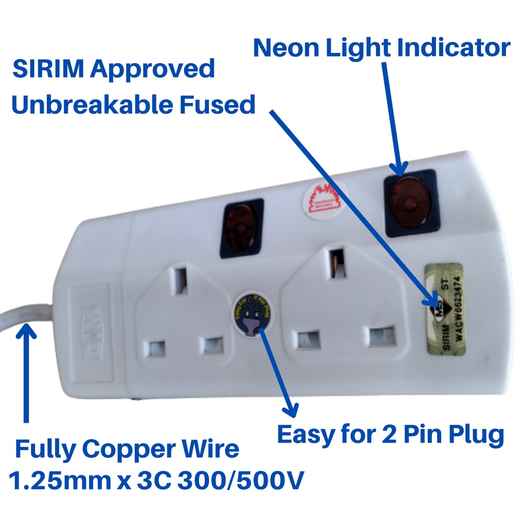 Trailing Socket 2 Gang 2M Extension w Neon Plug Adaptor / Penyambung Soket Wayar[GIM BRAND] [SIRIM APPROVED]