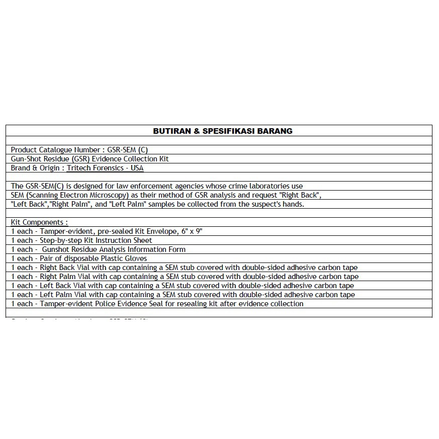 Tritech Gun-Shot-Residue GSR Forensic Evidence Collection Kit