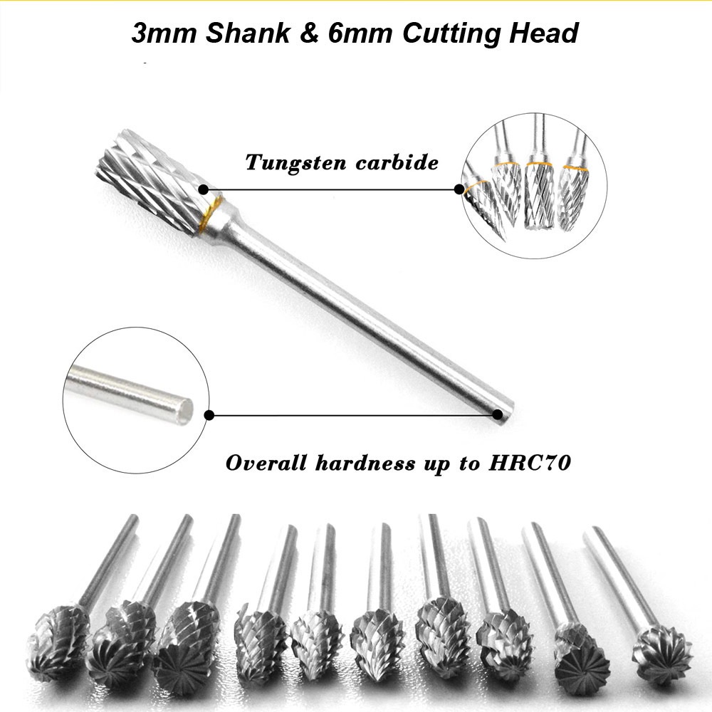 Tungsten Carbide Burr Set - Rotary Milling Cutter File Rasp for Metal, Wood, Plastic, and Stone with 3mm Shank