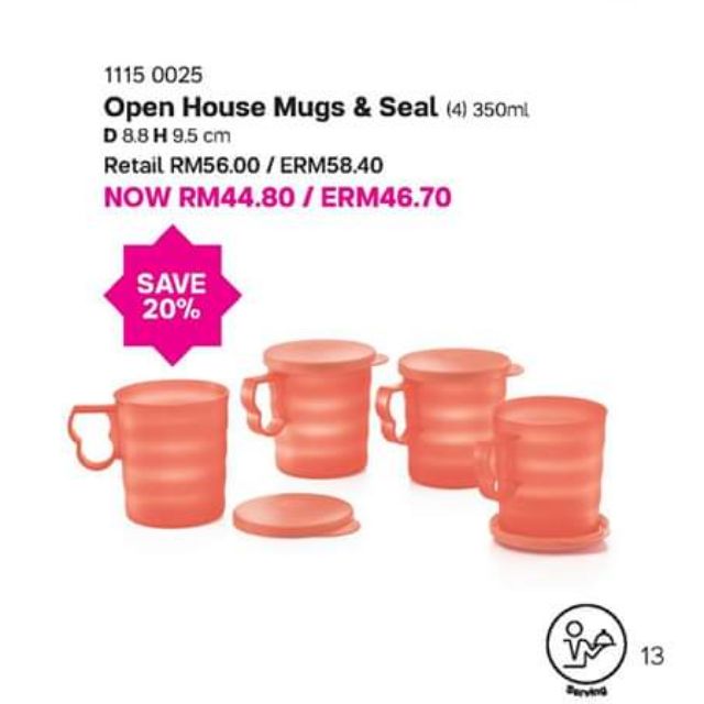 Tupperware (1set=4pcs) Open House Mugs with Seal Mug & Seals 350ml New Color Coral Blooms Salmon Red