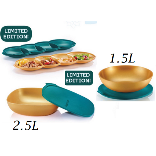 Tupperware Allegra 4 Peas Tray / Allegra Square Bowl 2.5L /Allegra 1.5L Full level Apr24 gold green Raya open house