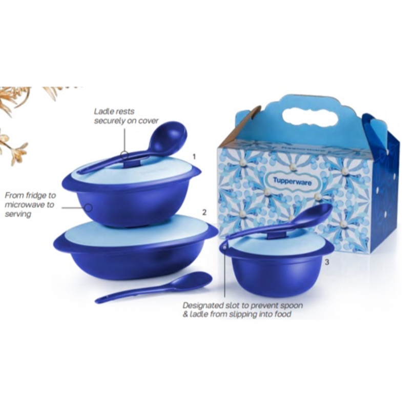 Tupperware Royale Blue Serveware Set and Platter Round Server with Serving Set Spoon Blossom Petit #tupperware #royal