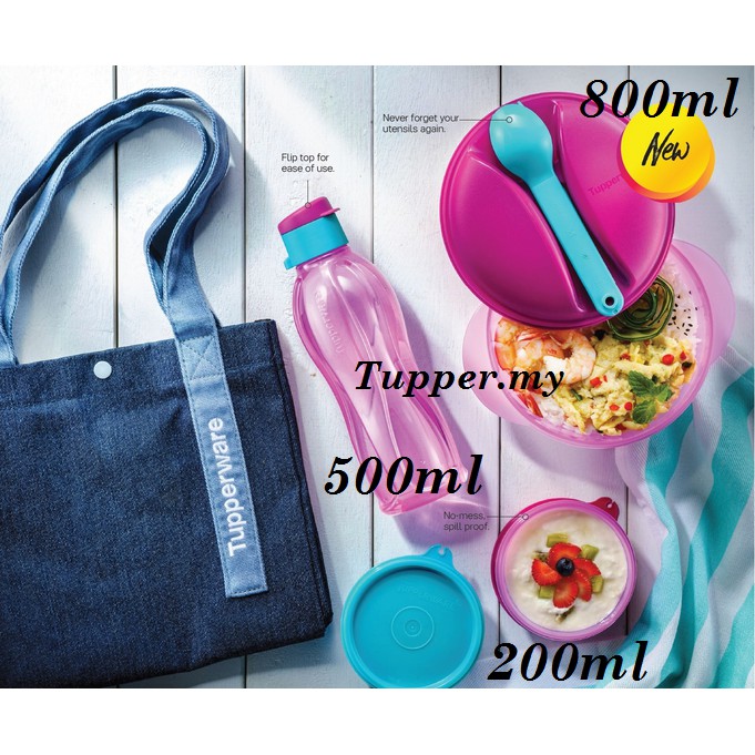 Tupperware Safe2Go Lunch Bowl Jolly Microwave/Fork spoon/Eco Bottle 500ml/Small Round Container/Blue Jean Satchel Bag