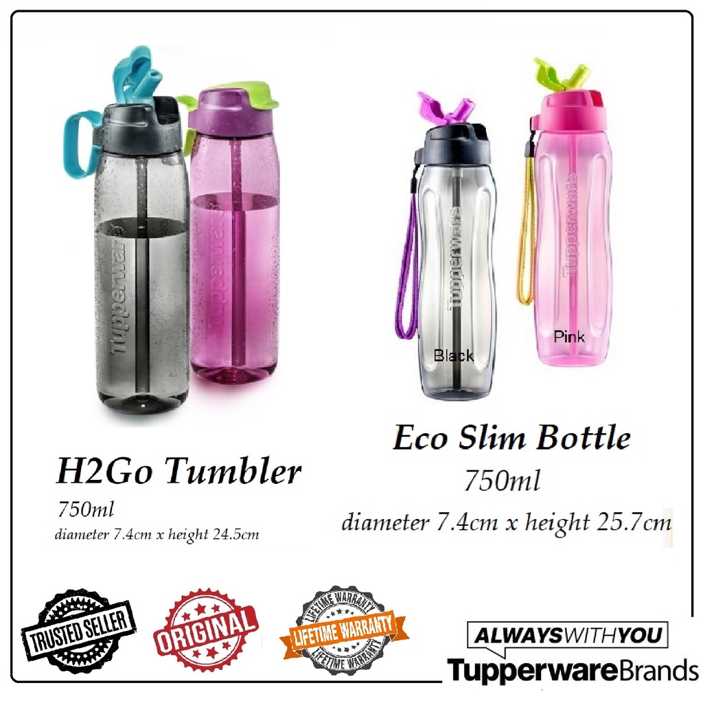 Tupperware Slim Eco Bottle (plastic) or H2Go Bottle (acrylic) with Straw 750ml Pink or Black