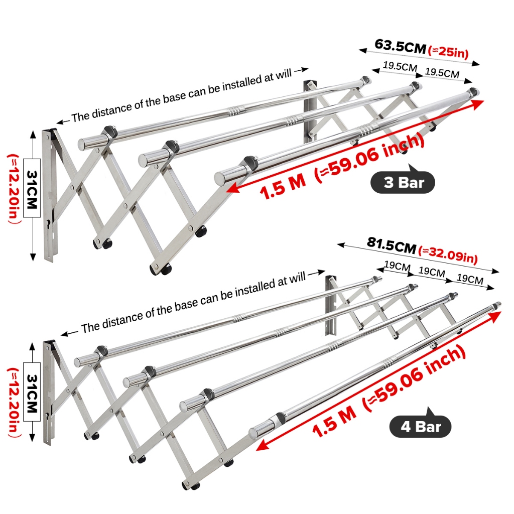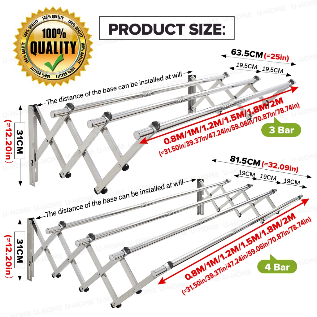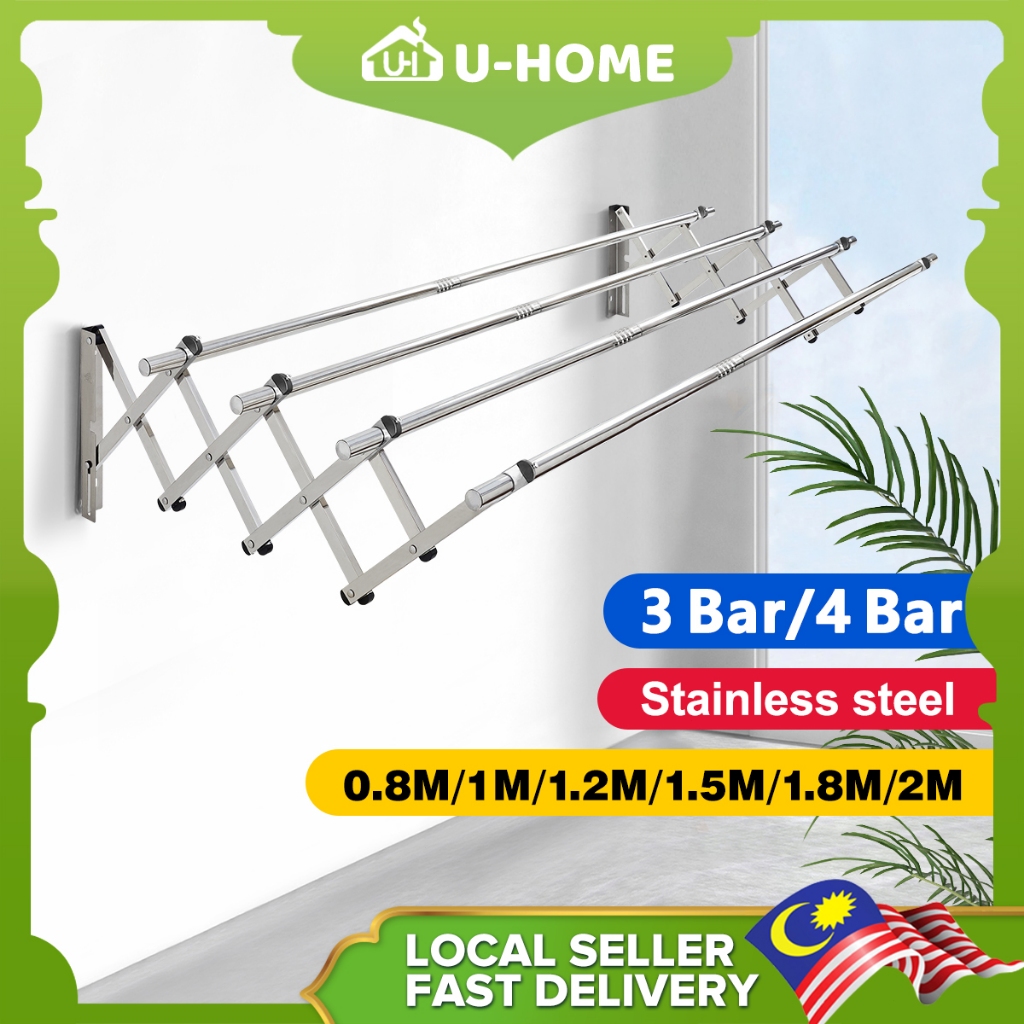 U-HOME 3 Bar/4 Bar 1M-2M Retractable Cloth Hanger Stainless Steel Ampaian Baju Wall Mounted Clothes Drying Rack