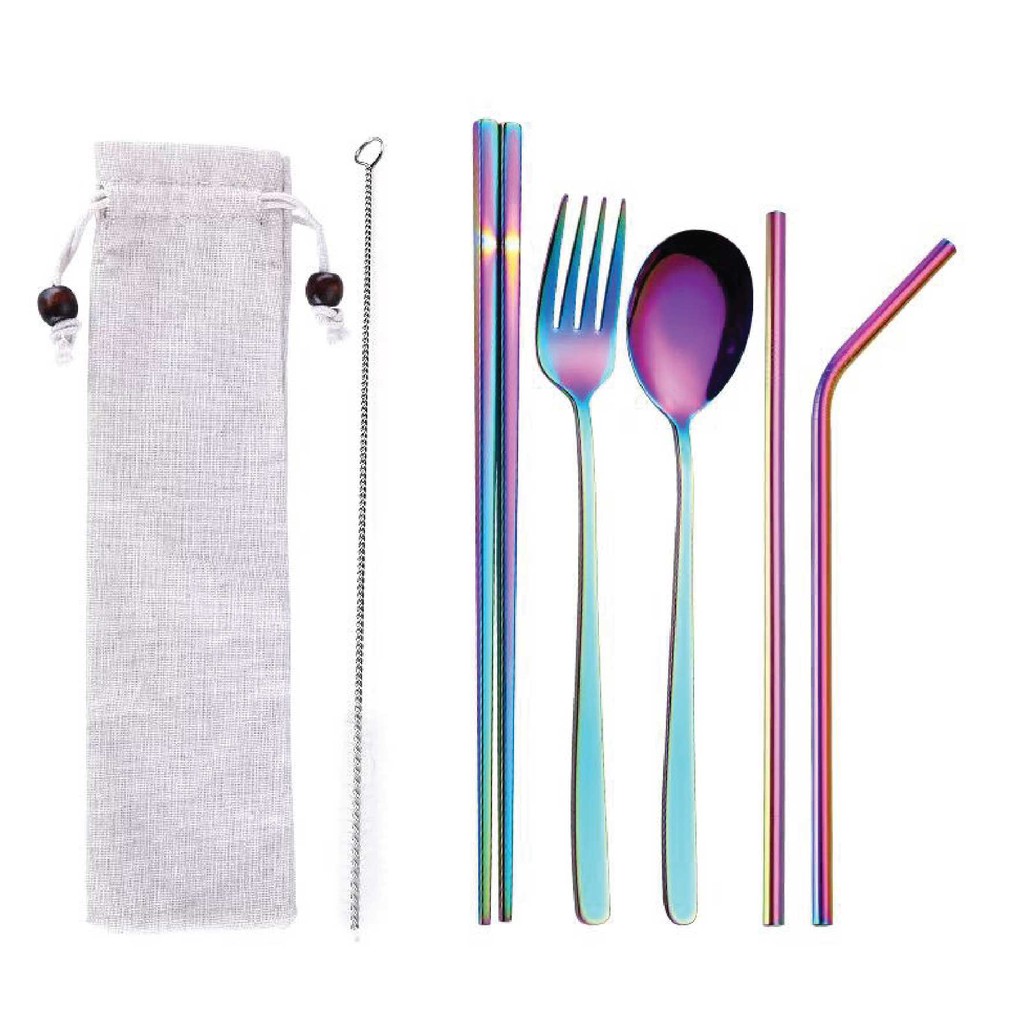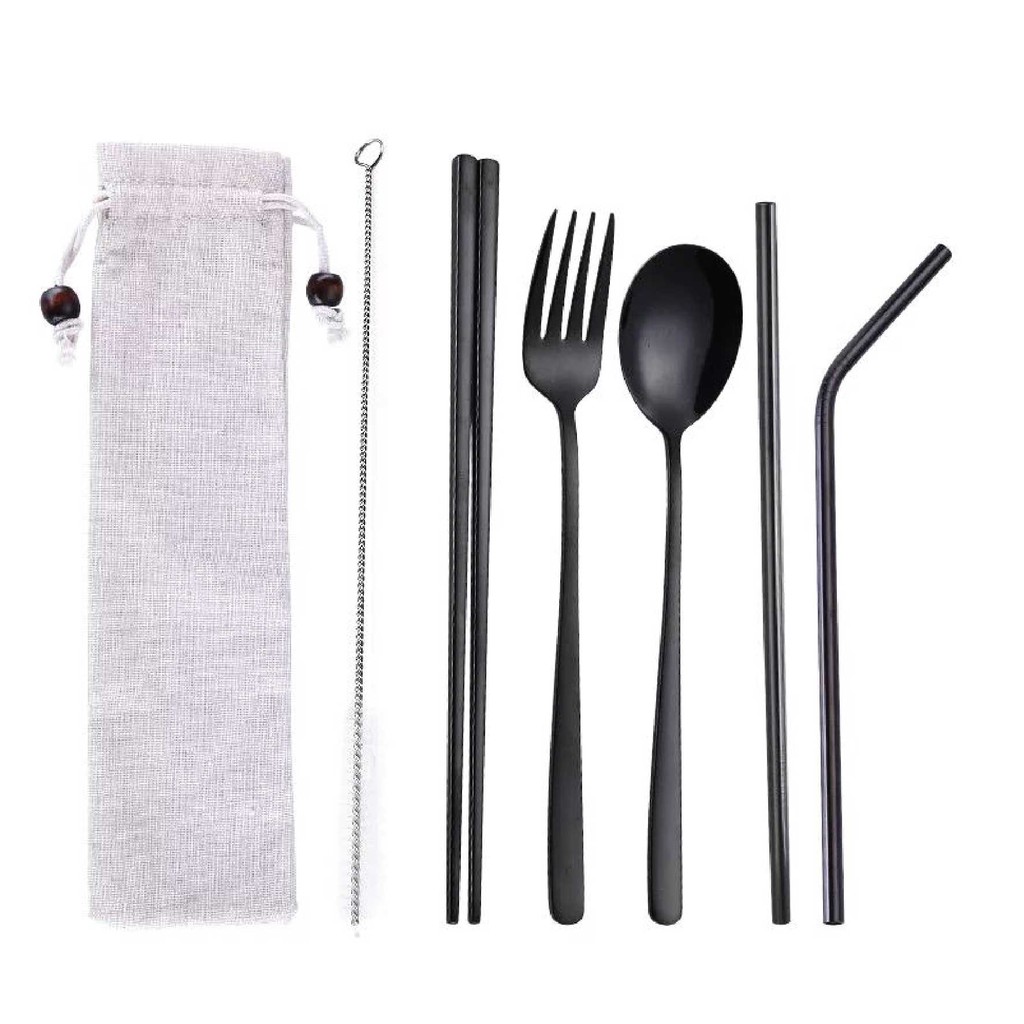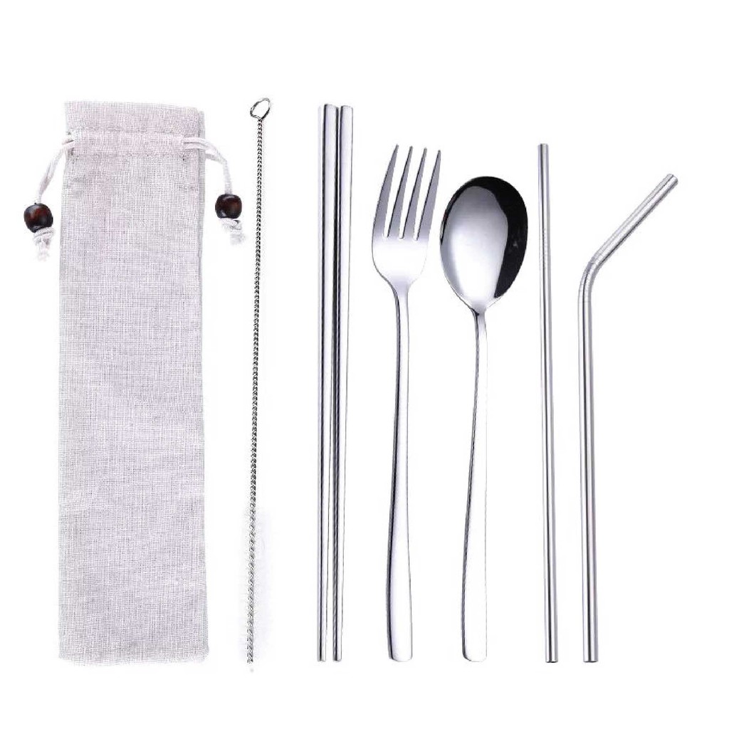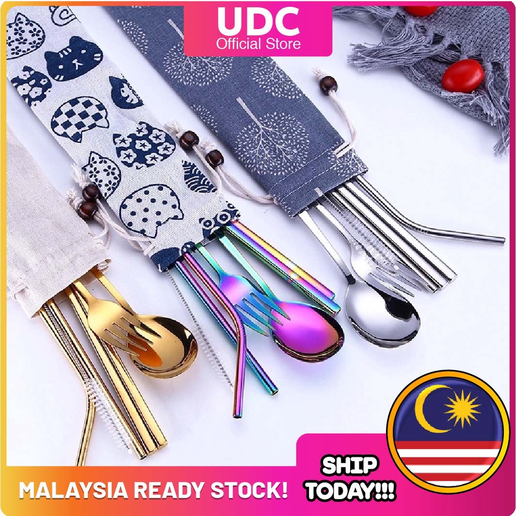 UDC 🍴 304 Stainless Steel Straw 7 In 1 Utensil Spoon Fork Chopstick Straw Set Reusable Metal Cutlery Set/ Set Sudu Makan