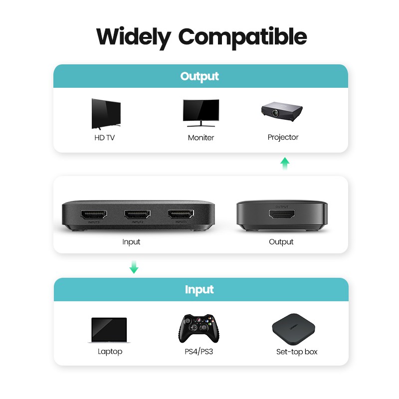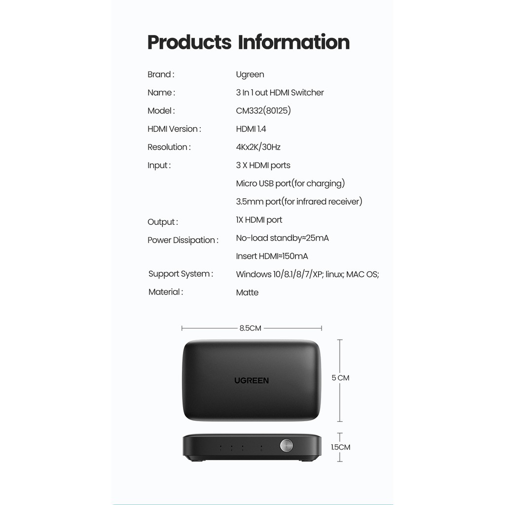 UGREEN HDMI Switch for Xiaomi Mi Box 3 In 1 Out HDMI Switcher 4K/30Hz for TV box PS4 Switch HDMI 4K with HDMI Cable