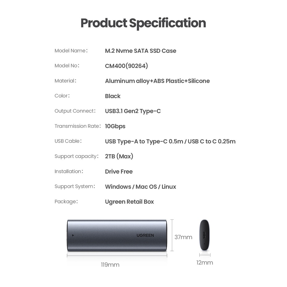 UGREEN M.2 NVMe and SATA SSD Enclosure Reader USB C 3.2 Gen2 Thunderbolt 3 Compatible