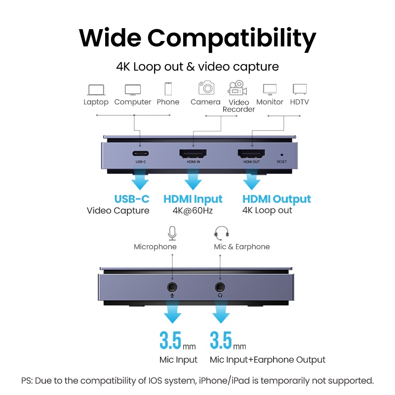 UGREEN Video Capture Card 4K HDMI to USB/USB-C HDMI Video Grabber Box for PC Computer Camera Monitor Live Stream Record