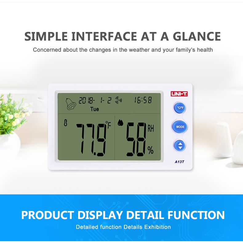 UNI-T A13T Temperature Humidity Meter Indoor Temperature and Humidity Table Date/Week/Time/Alarm Clock Humidity Display