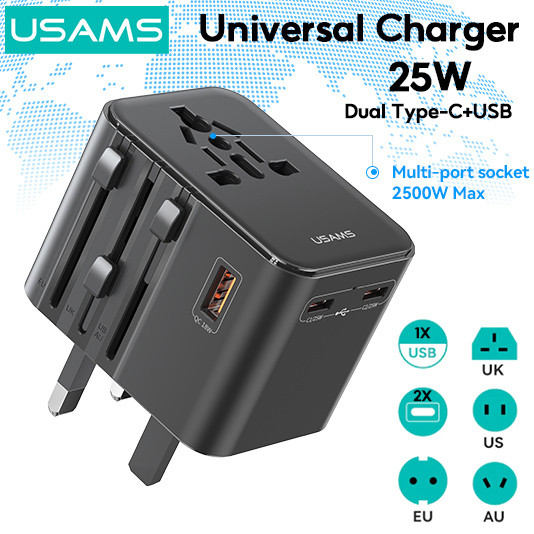 USAMS Travel Adapter Universal International Charger Adapter Wall Socket USB Type-C Phone Charger
