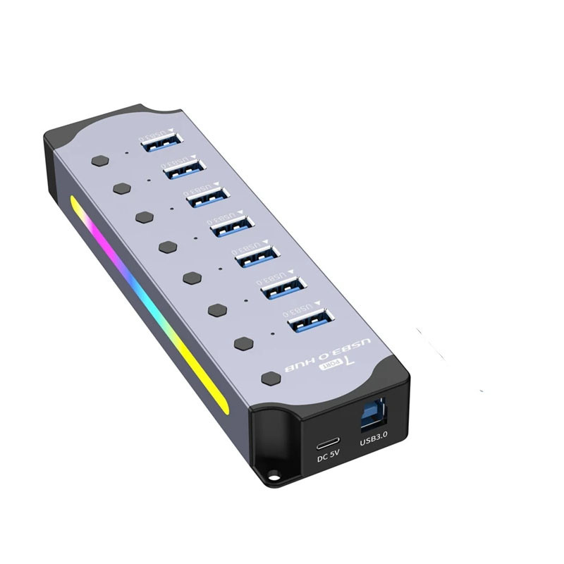 USB 3.0 Hub 4-Port 7-Port 10-Port RGB Hub with LED Button Switch 5Gbps Fast Transmission 12V Charger USB Splitter for PC Laptops