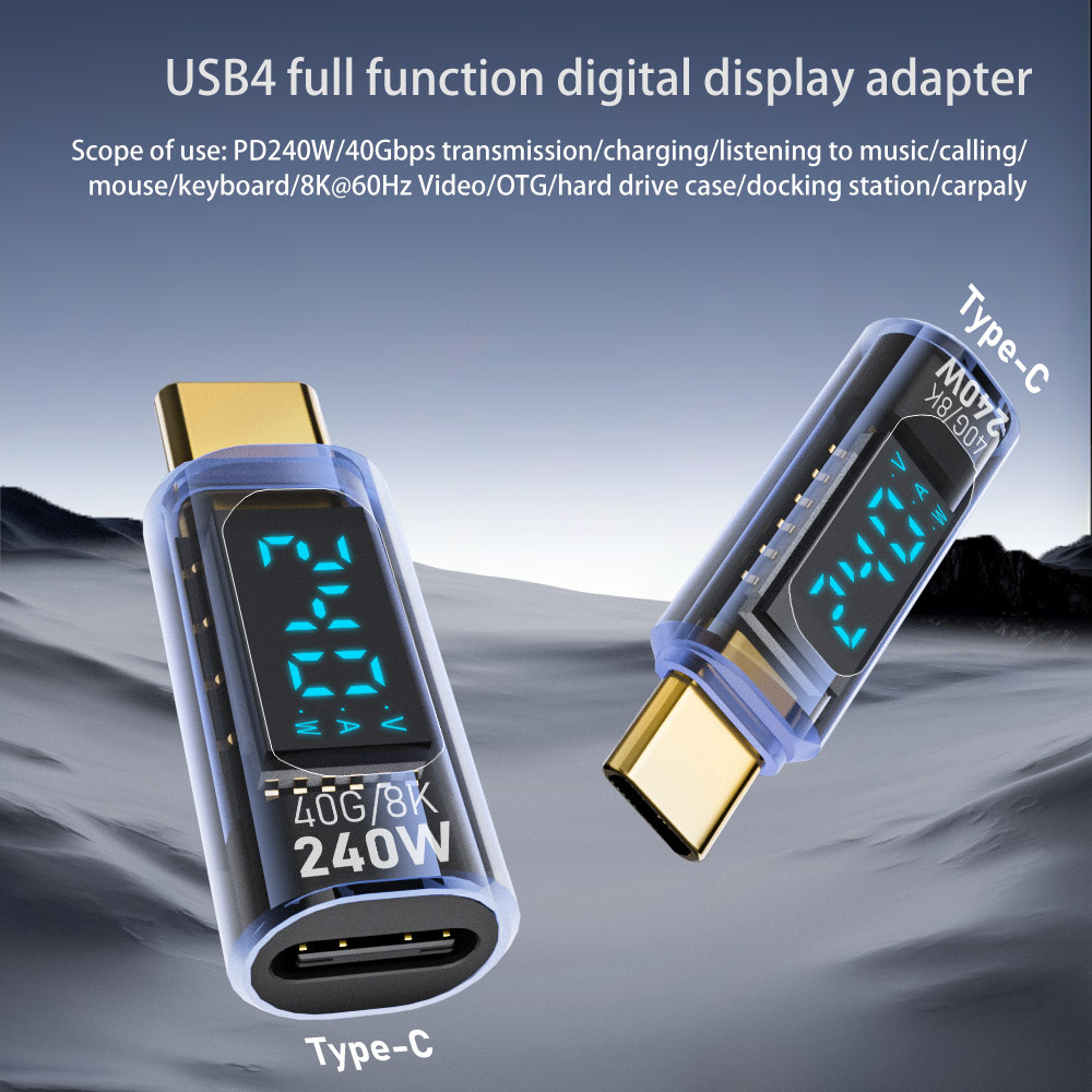 USB C Adapter LED Power Display Screen 240W 40Gbps PD3.1 Type-c Cable Power Meter Tester with Digital Display USB C Male to Female Adapter