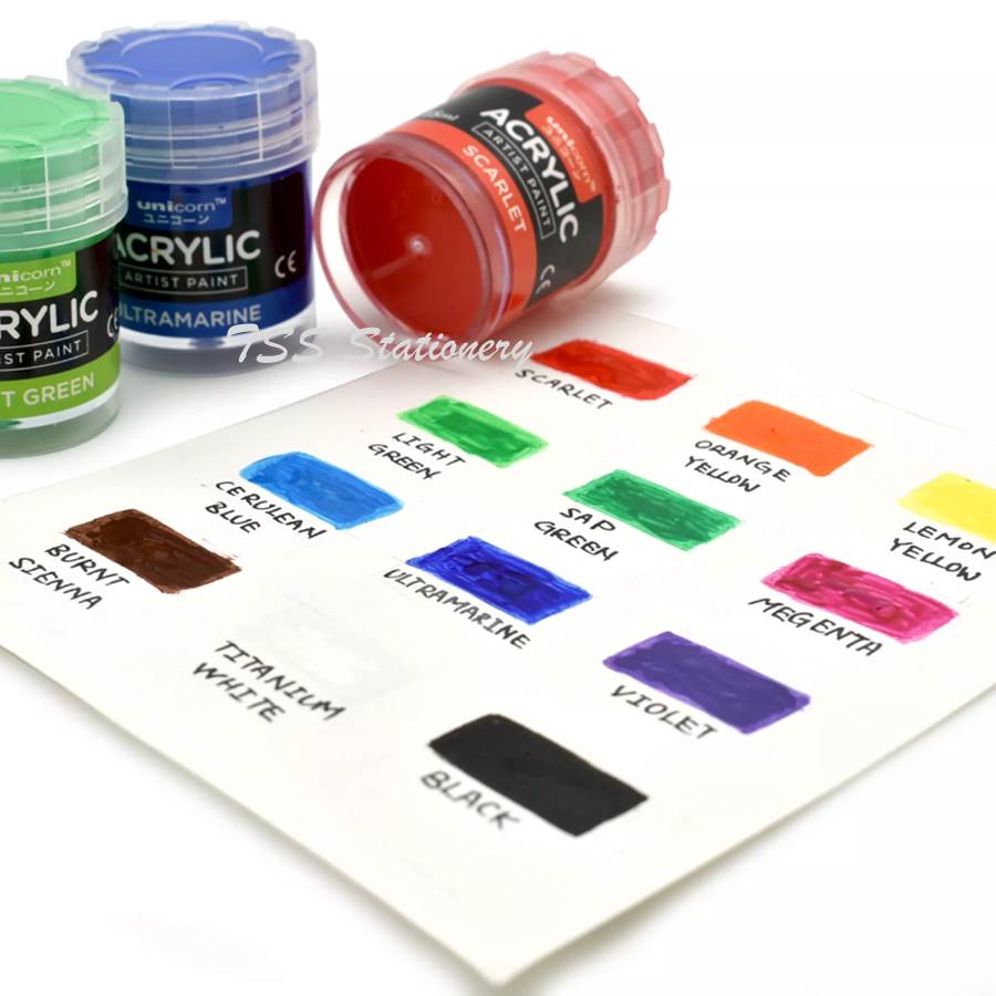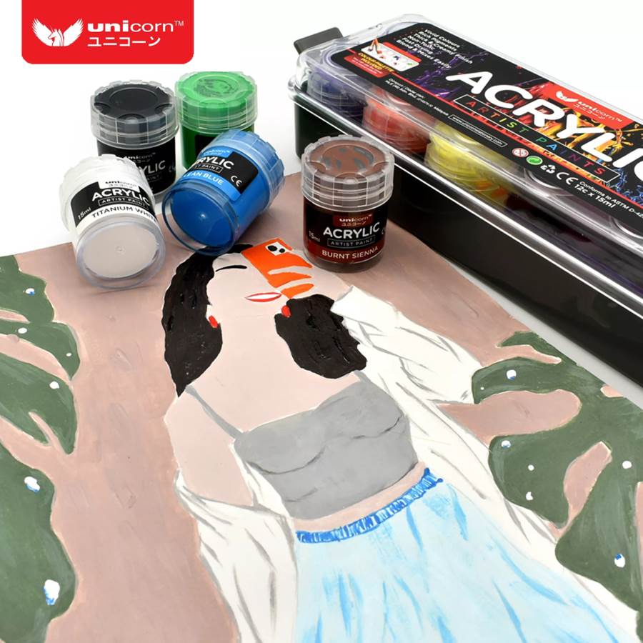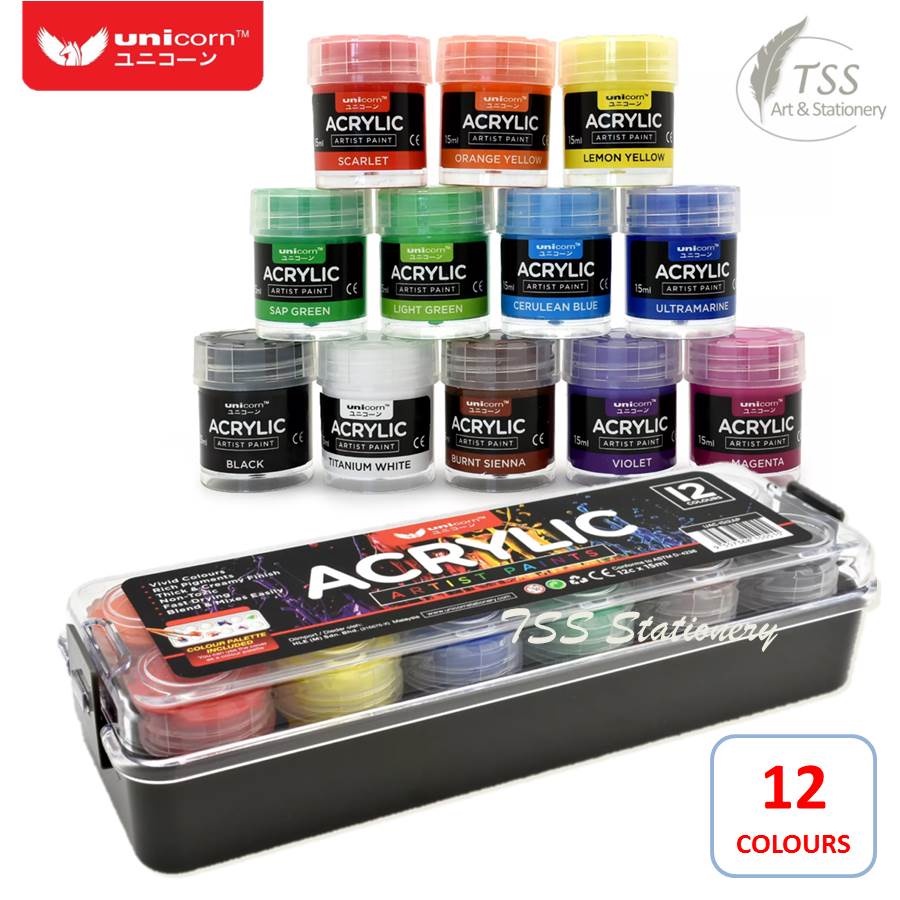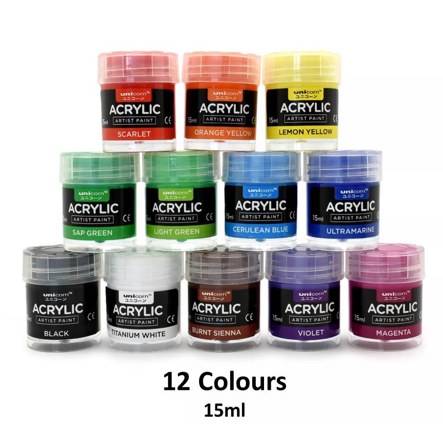 Unicorn Acrylic Colour Paints 12 Colours (15ml) Set UAC-1512AP - Acrylic colour paint for students, kids