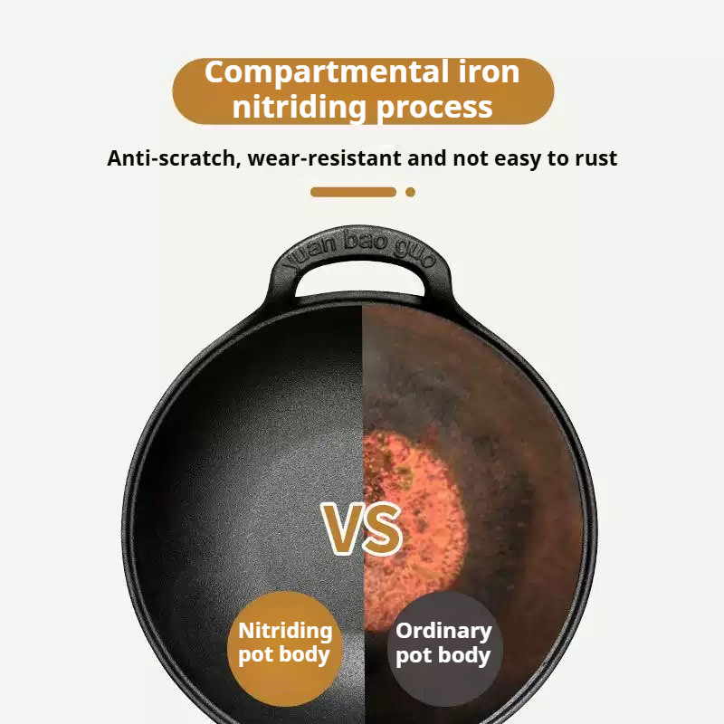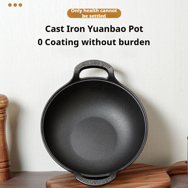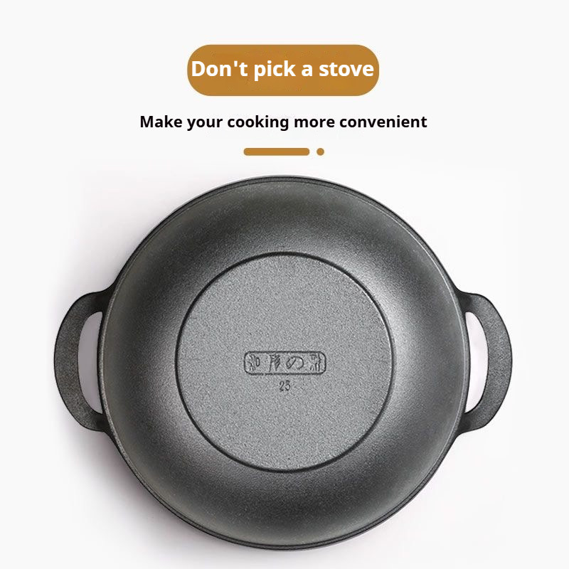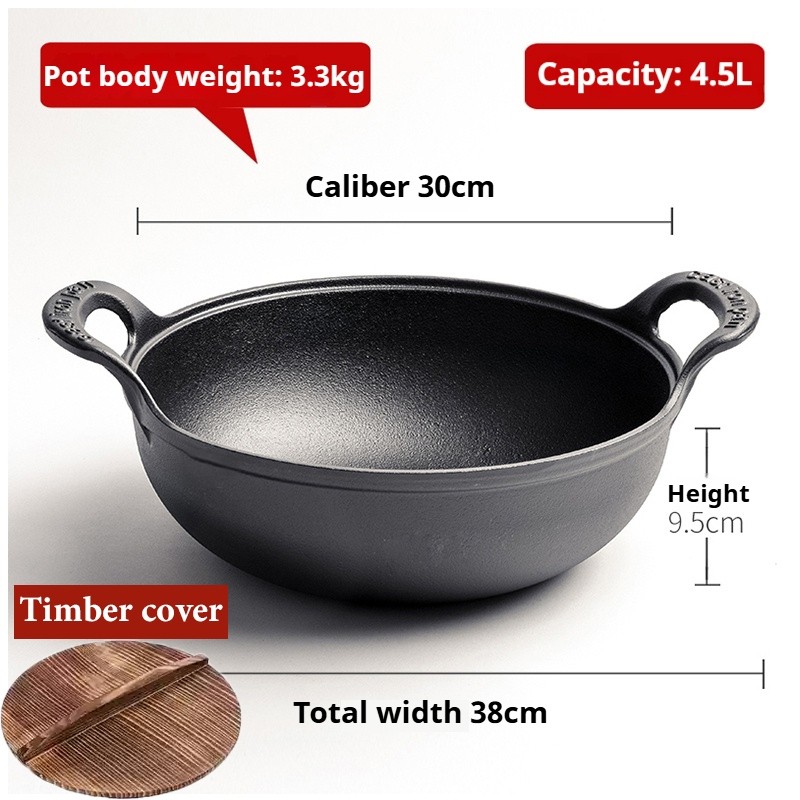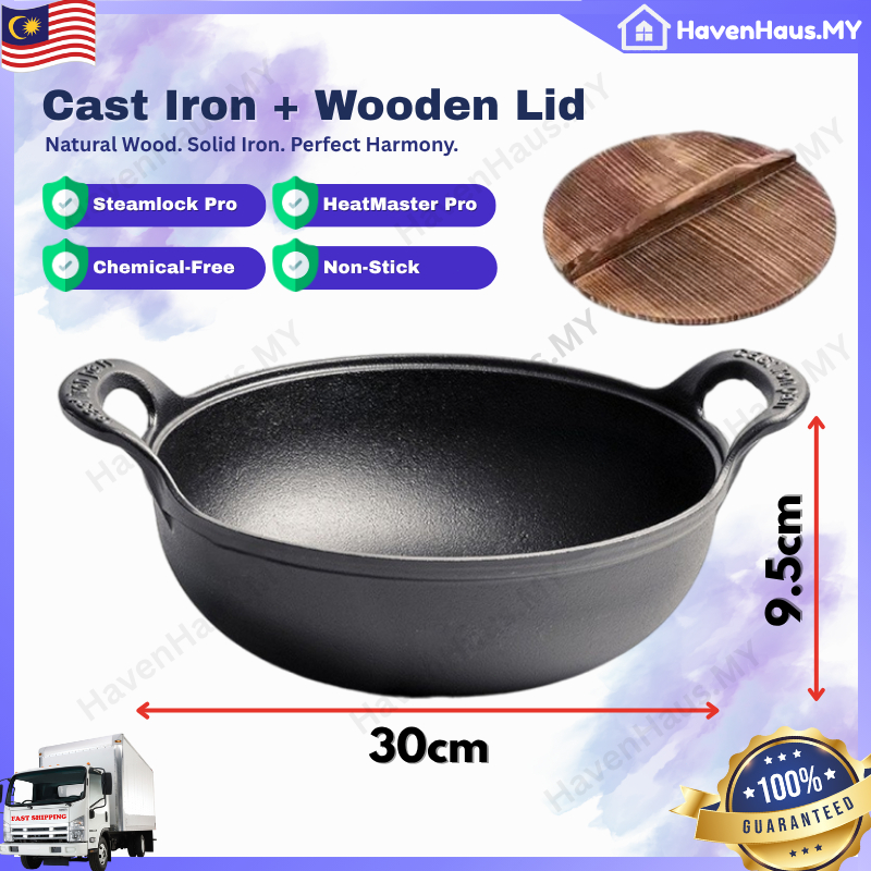 【Hot Deal】 30CM Cast Iron Wok Pan with Wooden Lid & Side Handles Kuali Besi Tuang Non-Stick + Penutup Kayu Cook Kitchen