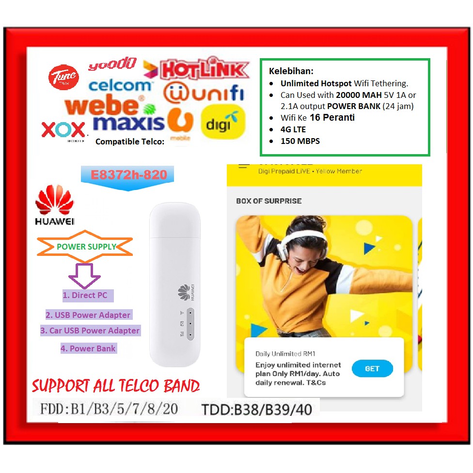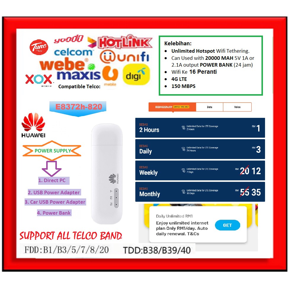 Unlocked Huawei E8372h-820 150Mbps LTE CAT4 WiFi Tethering Hotspot USB Dongle Modem SUPPORT UNIFI FULL BAND