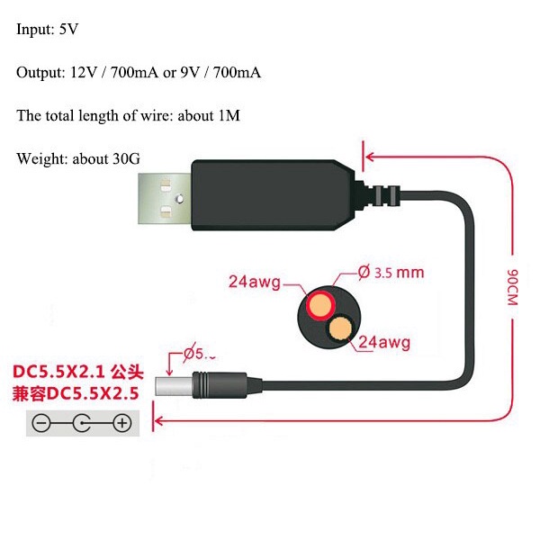 Usb Power Boost Line Dc 5v To Dc 9v / 12v Step Up Module Usb Converter Adapter Cable 2.1x5.5mm Plug