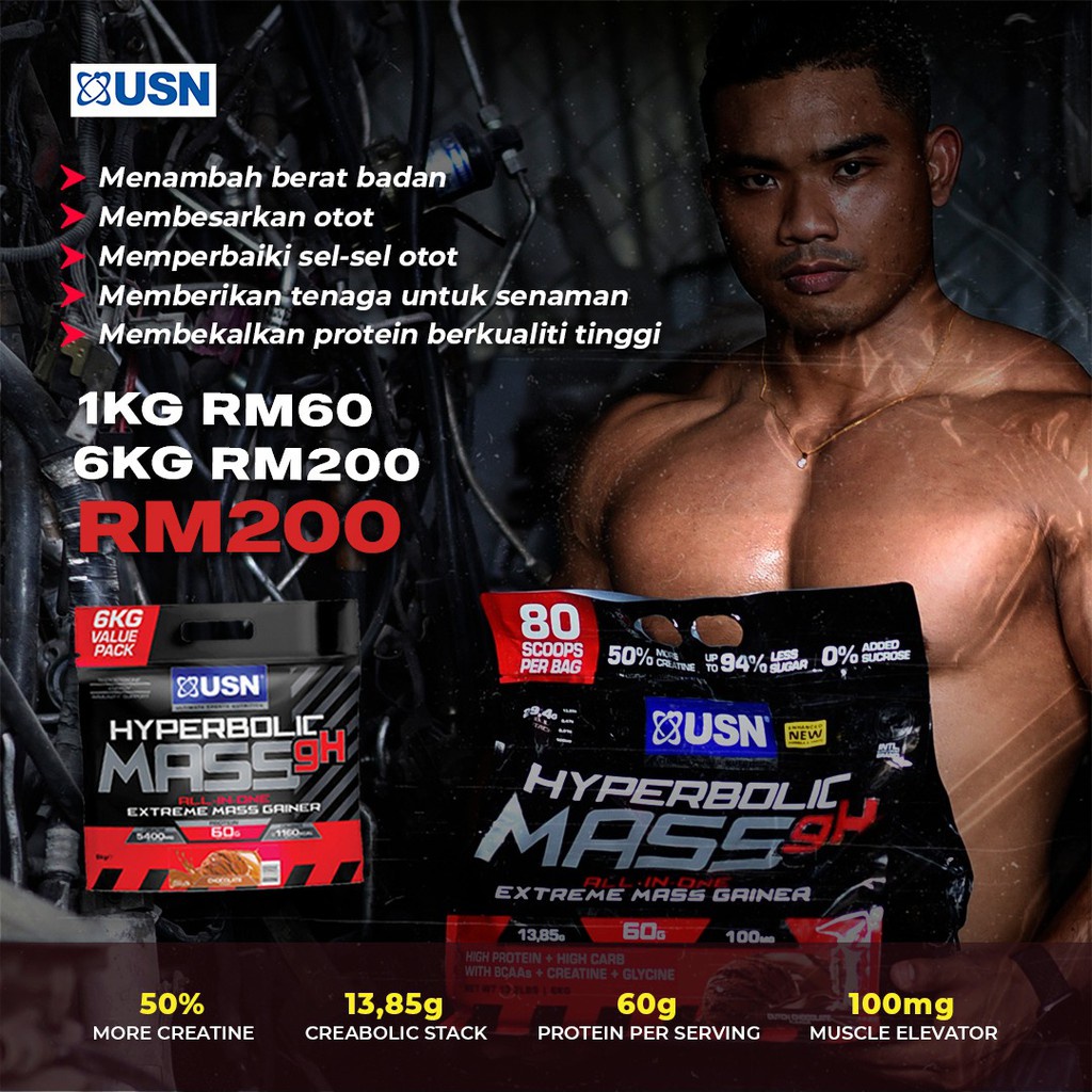 Usn Hyperbolic Mass gH Extreme Weight Gainer Protein Powder 6kg (Free Shaker) - Mass Gainer, Susu Gym Halal, Weight Gain