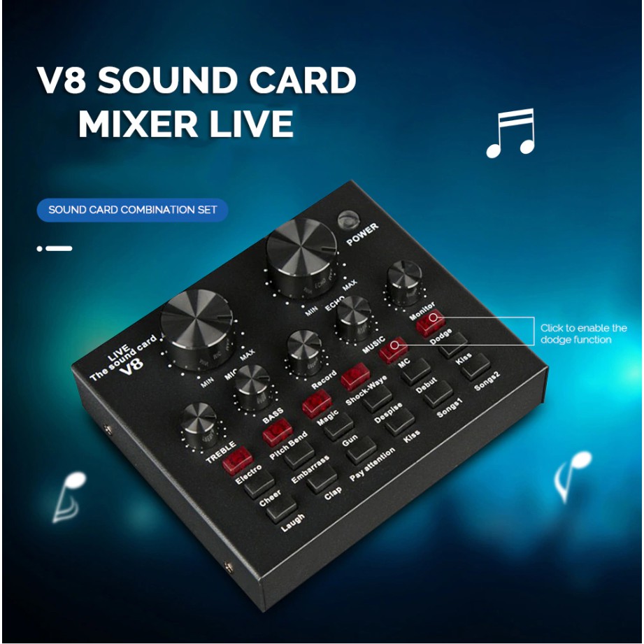 V8 Multifunctional Live Sound Card USB Audio Interface Intelligent Volume Adjustable Audio Mixer Sound Card for Record