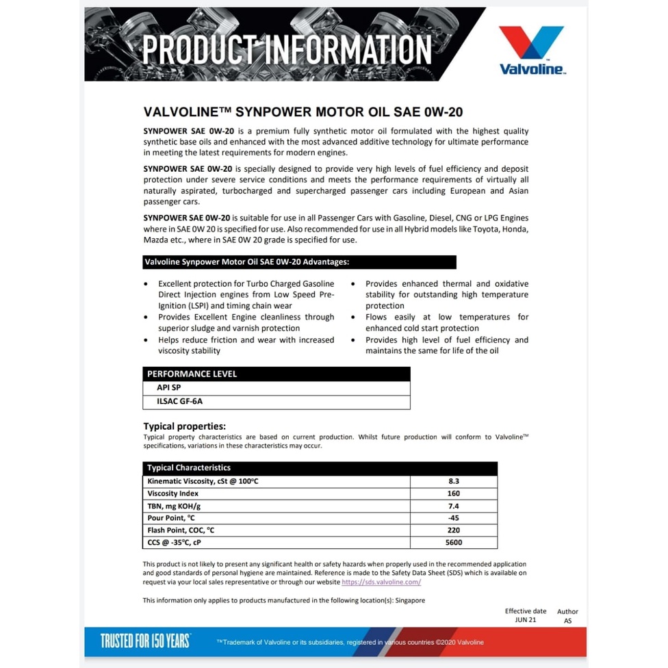 VALVOLINE SYNPOWER FULLY SYNTHETIC 0W20 API SP ENGINE OIL
