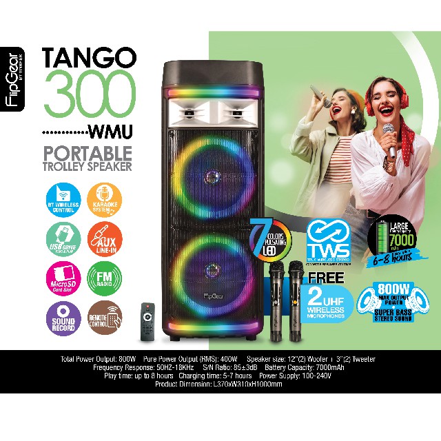 Vinnfier VF Tango 300 WMU TWS Portable Trolley Speaker Bluetooth 2x12inch Woofer Super Bass Karaoke FM USB Micro-SD