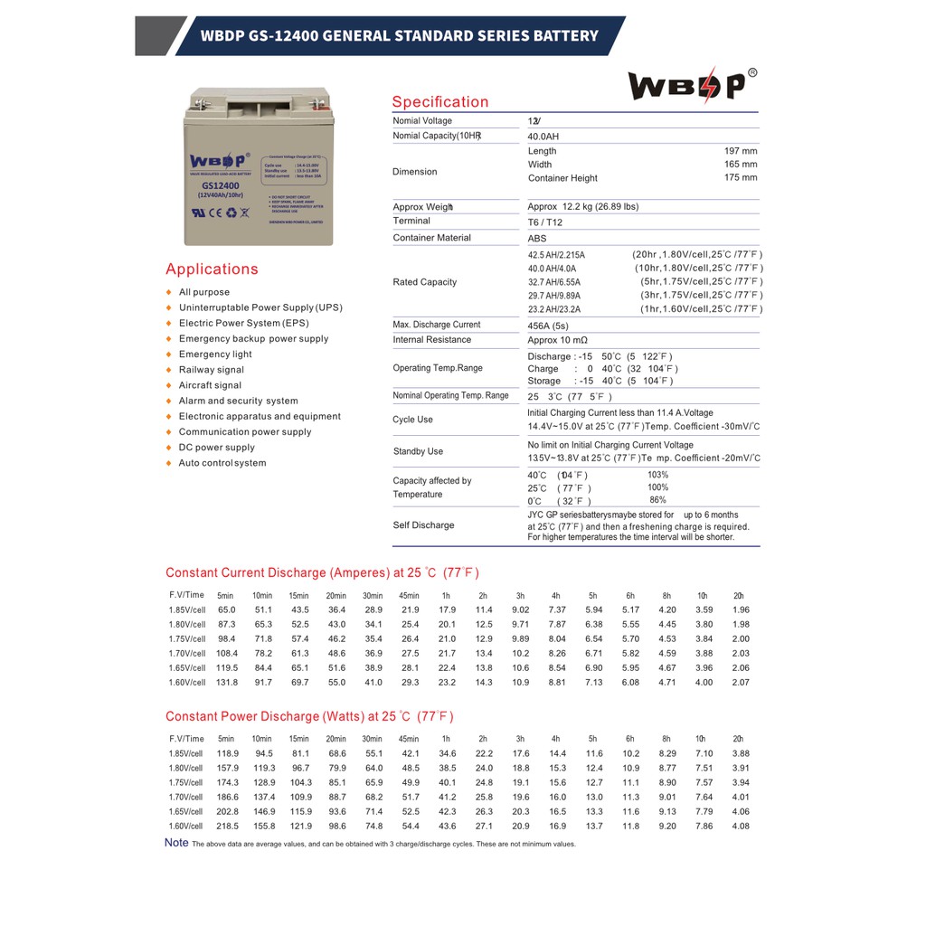 WBDP GS-12400 General Standard Series Battery 40.0Ah Nominal Capacity