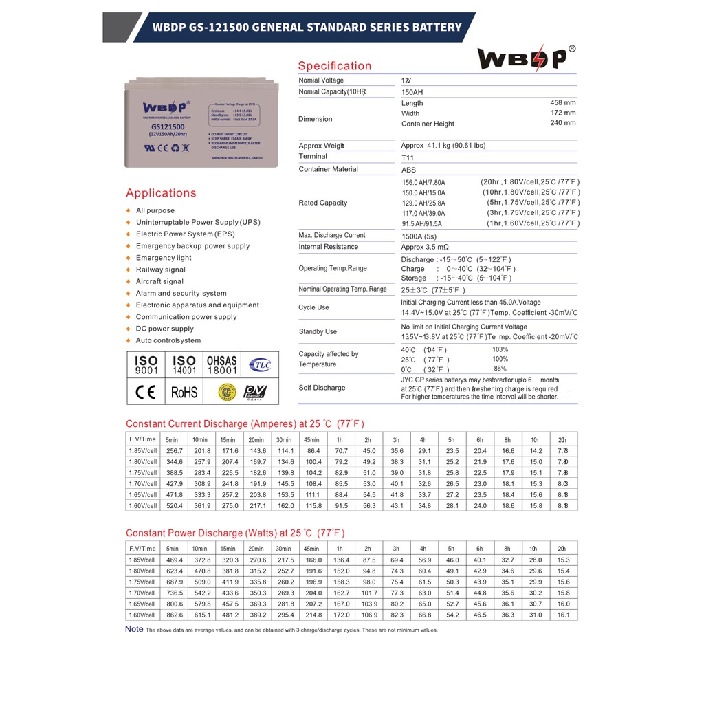 WBDP GS121500 General Standard Series Battery 150.0Ah Nominal Capacity