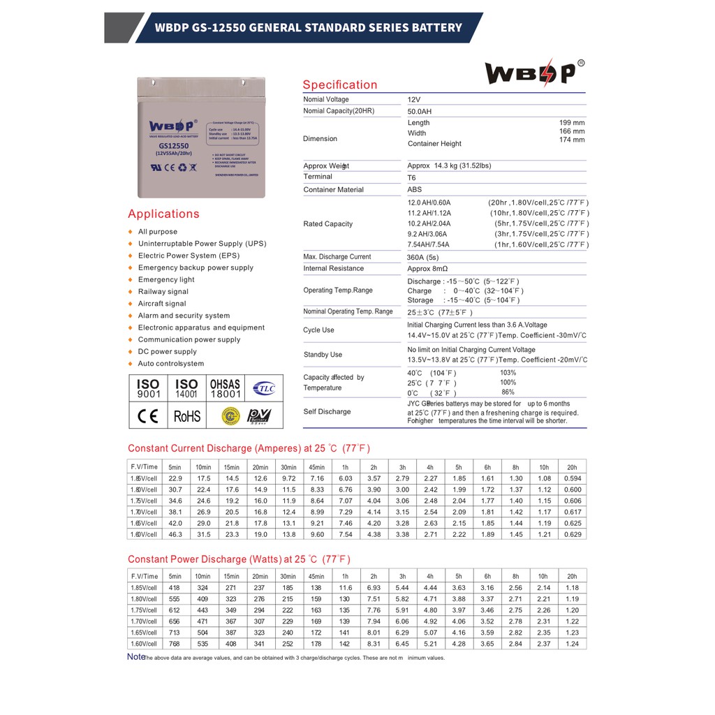 WBDP GS12550 General Standard Series Battery 55.0 Ah Nominal Capacity